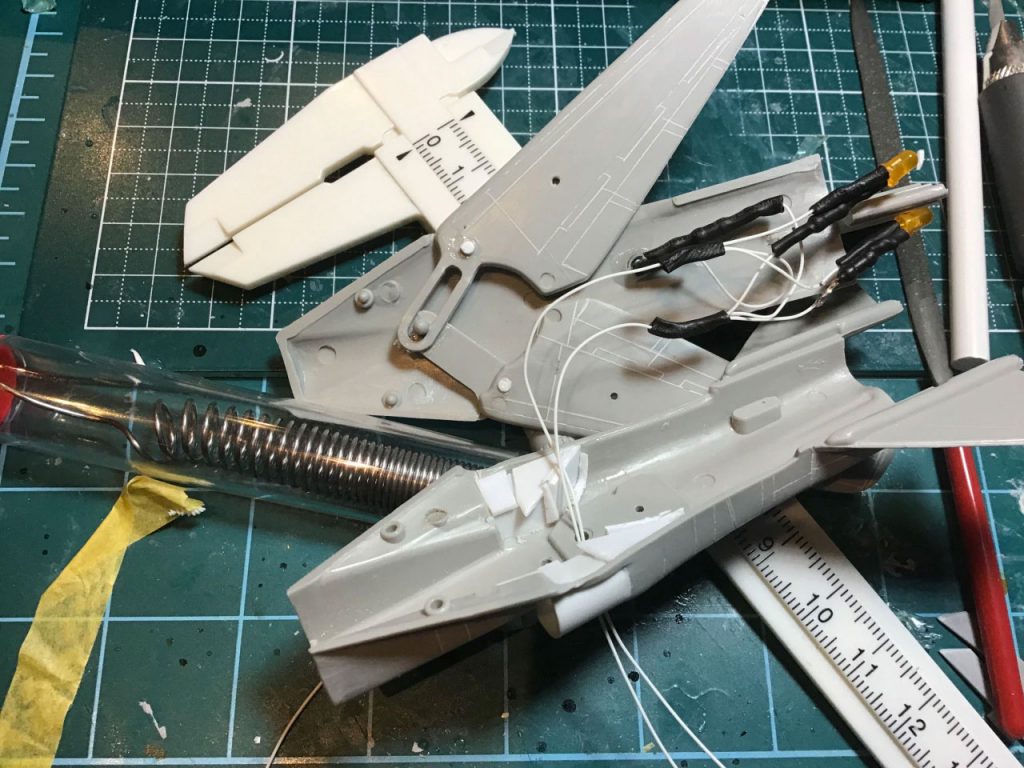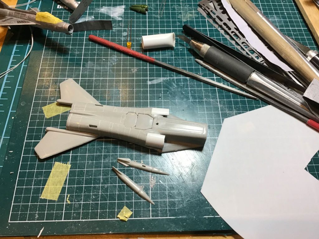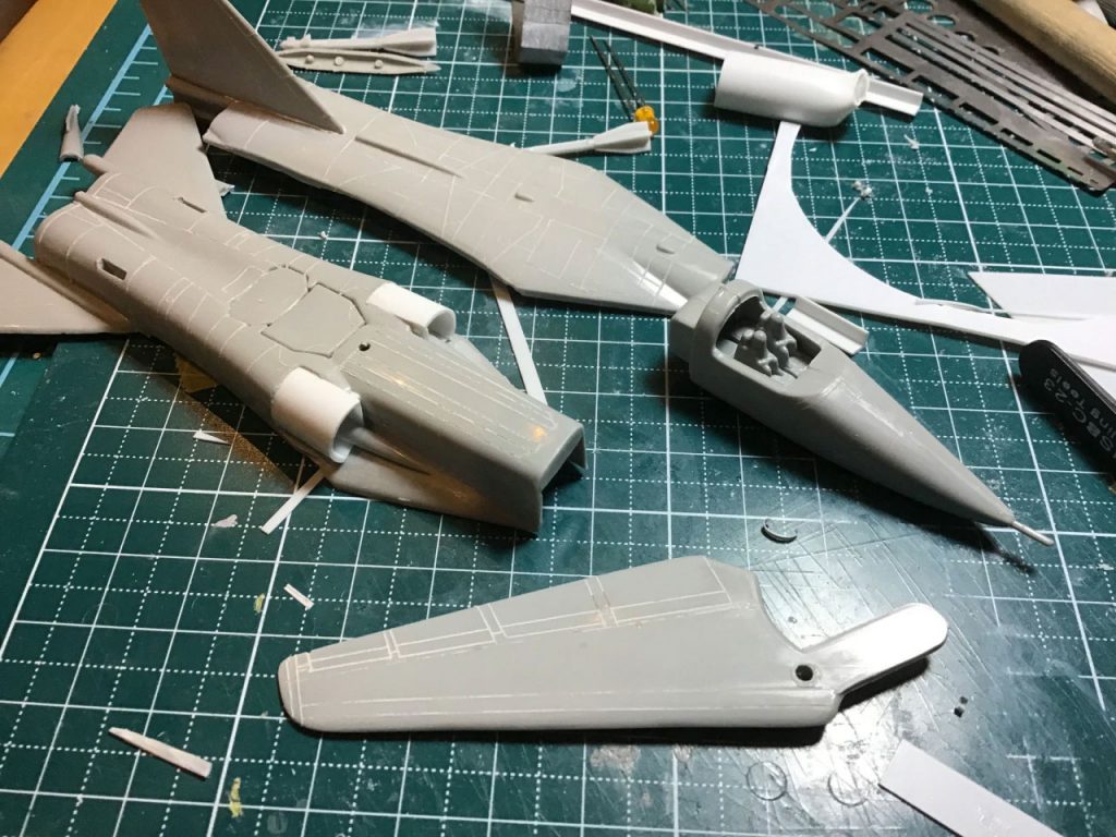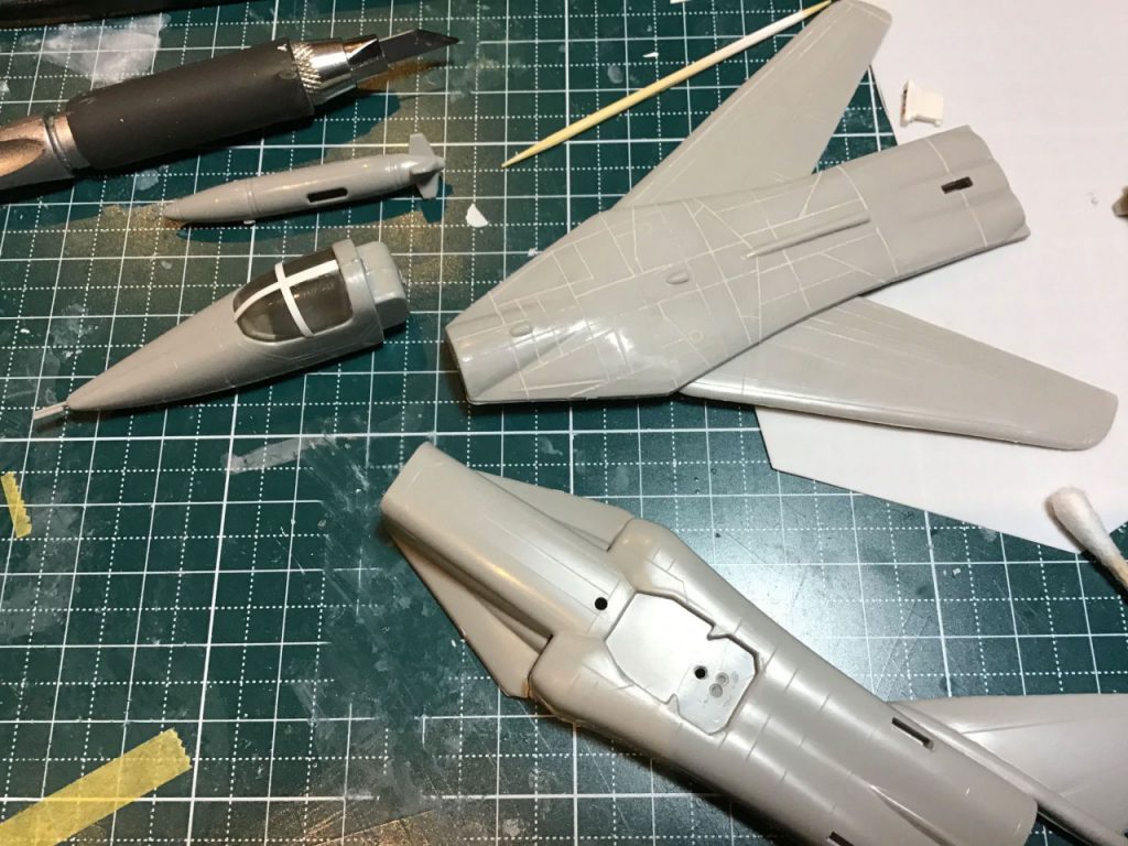 To make it into a passable ‘vark takes a lot of work though. First off there are no real panel lines to speak of… and what are there are raised. So I basically had to sand the whole thing smooth and scribe all my own. I think I did a pretty good job, and I was rolling along until I hit the wings. That’s when I discovered that Trumpeter hadn’t bother to actually make two wings. They’d just stamped both sides exactly the same and expected that no one would notice. So, after scribing one side, I had to take a picture of it, flip it, print it, and then use that as a guide for the other side. It wasn’t hard, but it was a pain.