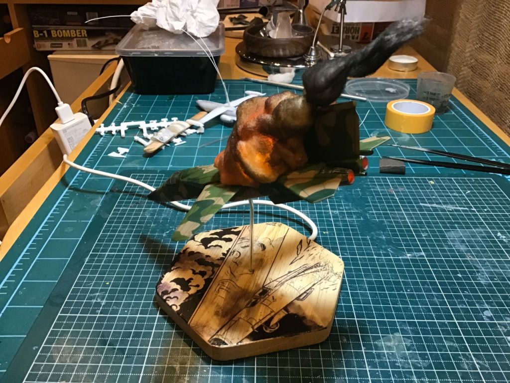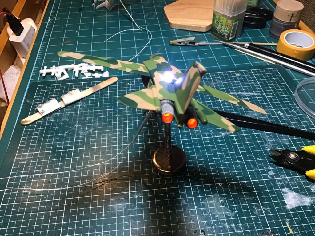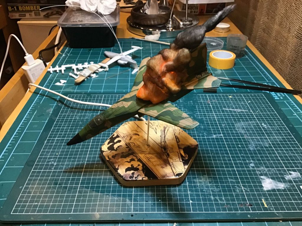 Since my Area 88 1/144 builds are meant to “capture a moment of action” from the manga, I decided to try my first real explosion… but I kinda chickened out. I really should’ve tried to chop the fuselage in half and make the fireball a real ball, but after I only put it the one LED light on top, I didn’t feel like trying to retro-fit one on the bottom as well. It’s strange though, because this would’ve been a kit certainly deserving of being chopped in half.