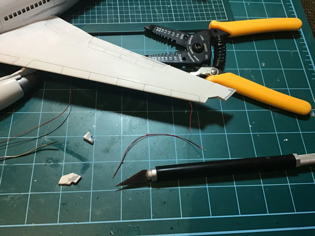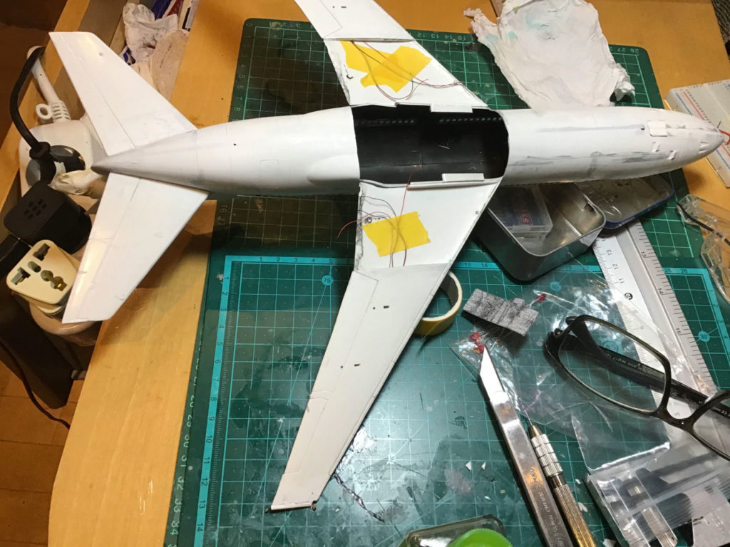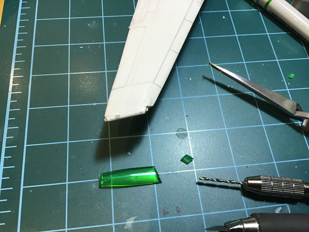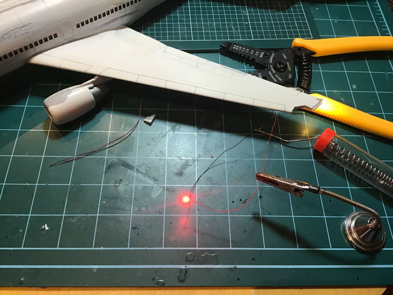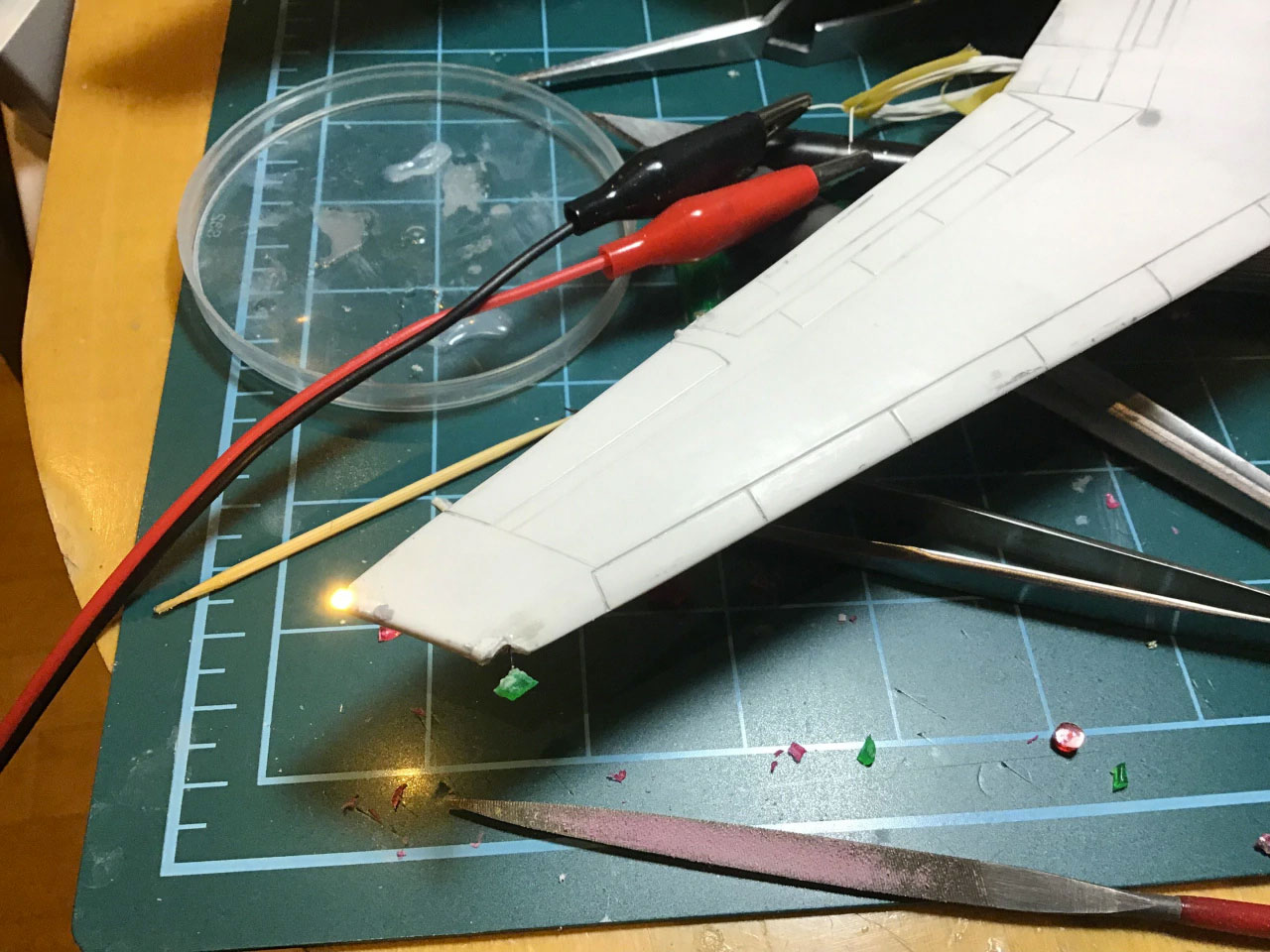 What man-handling you might ask? Well I only got the idea to include LED lights after the fuselage was glued together. So, after ripping one the wings, wiring in the lights, glueing it all back together, then changing my mind as to the size of the fuselage lights and cutting those it and re-wiring in new ones… and then having the wires break in the wing tips and having to open them up again… well I ended up throttling the build a few times. I even managed to break the wires off at the fuselage after the clear stand post got snapped off during the final wiring together of the lights in the base.