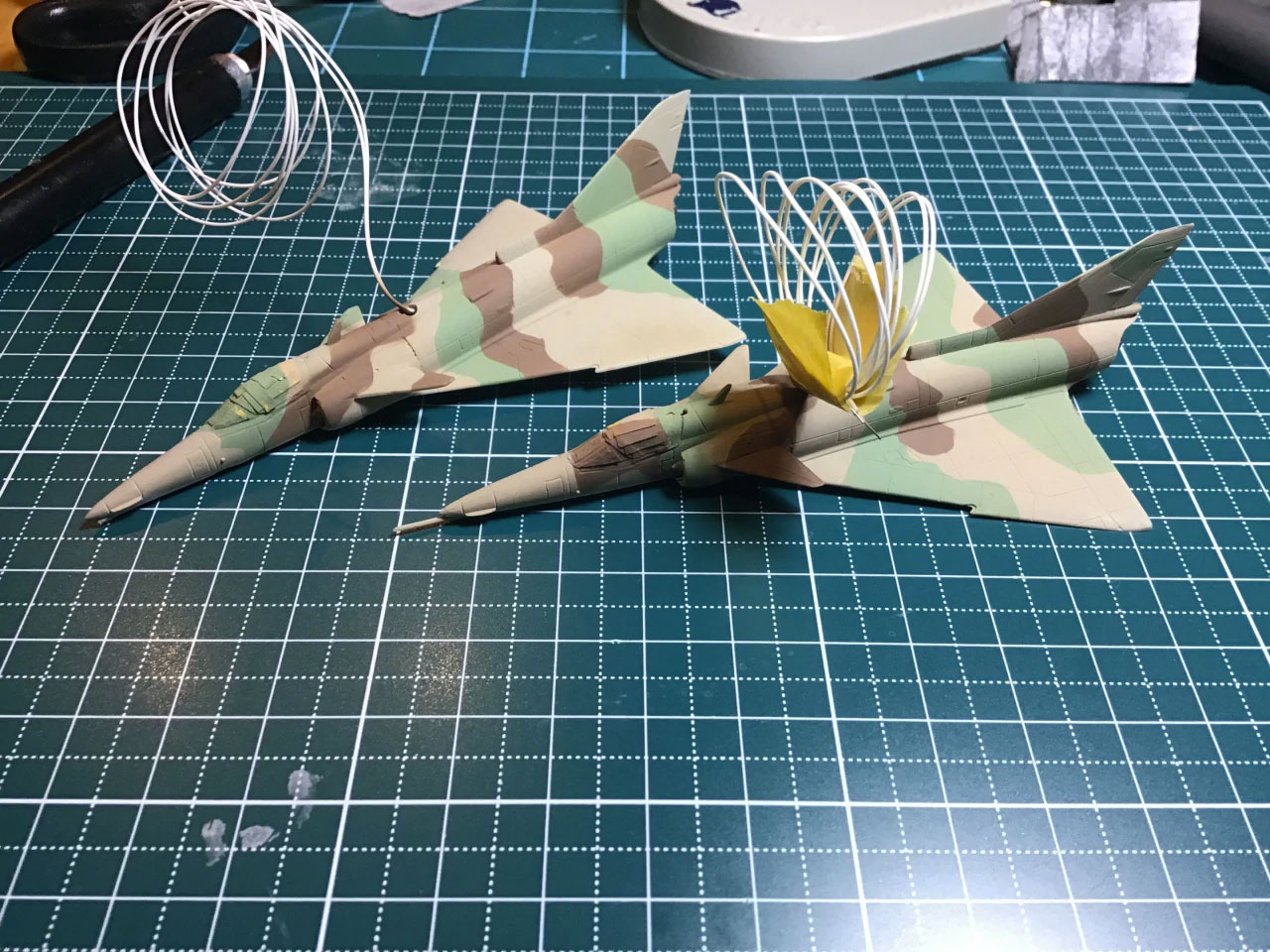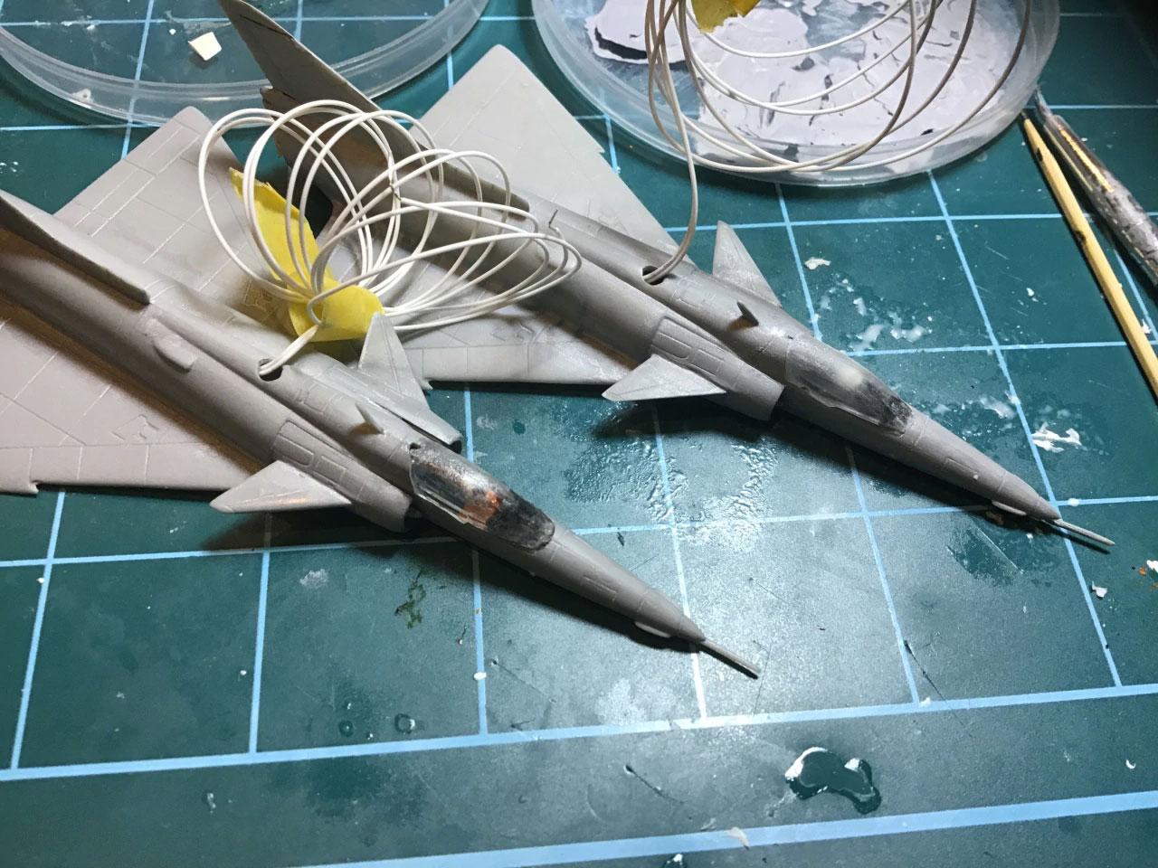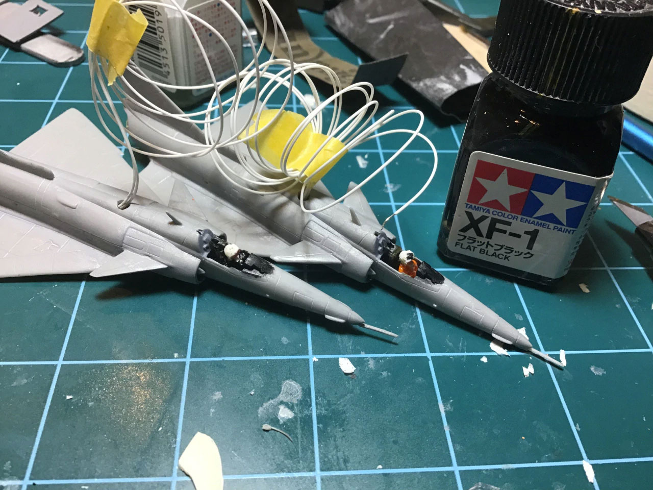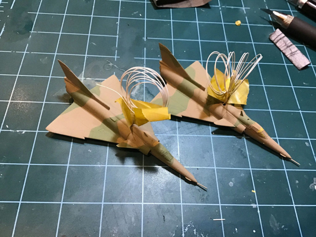 the Kfirs, being much newer kits went together well. The biggest problem with them was adapting to the idea that they would be displayed upside down. It seems like a small difference, but it can throw you off because things aren’t where they normally are. The only real issue with the Kfir portion of the build was the canopies. I’d heard about people cracking them, so I thought I was being careful. But not careful enough, I guess. The other issue was really just dumb luck, in the scuffle where I lost the front windows, I somehow managed to graze on of the Kfir wings with the soldering iron, talking a melted chunk out of it. Oh, well, battle damage… right?