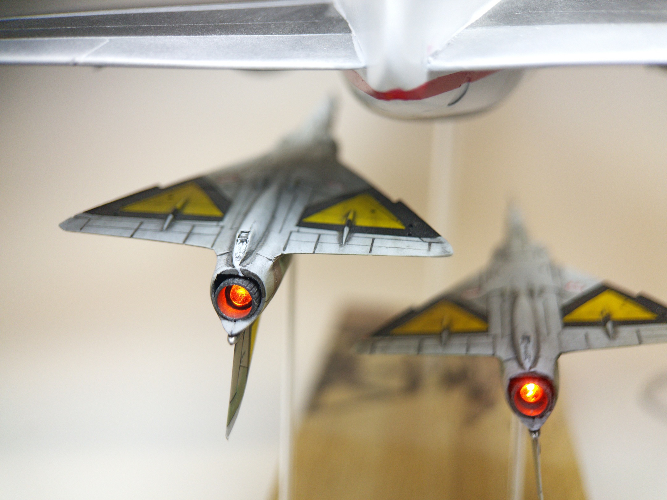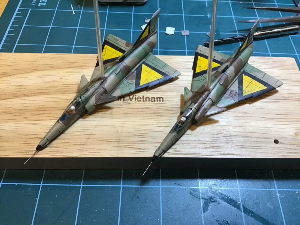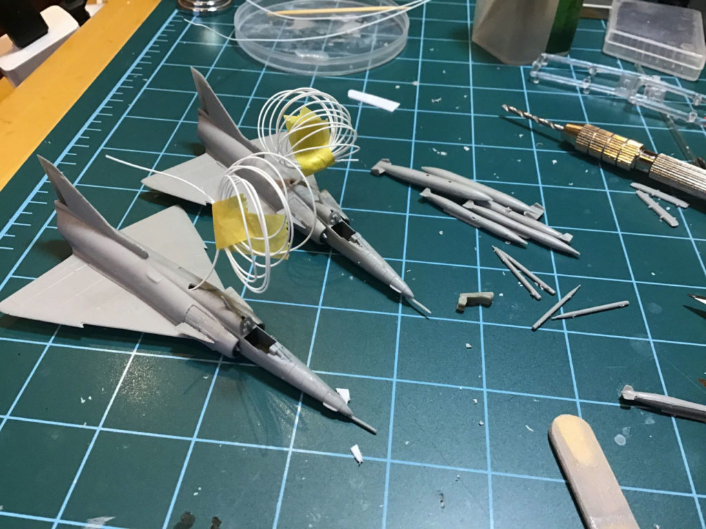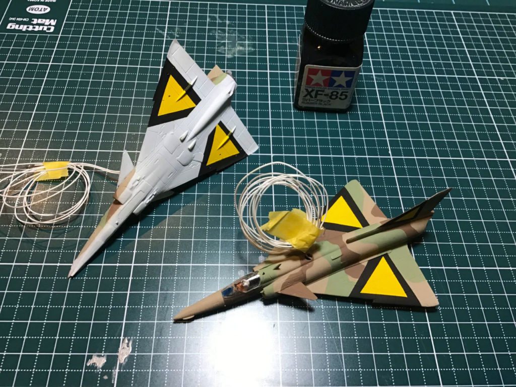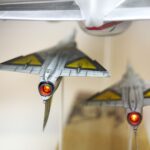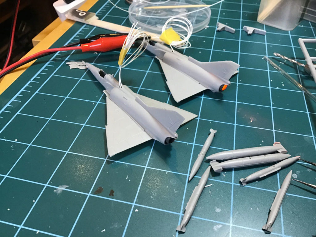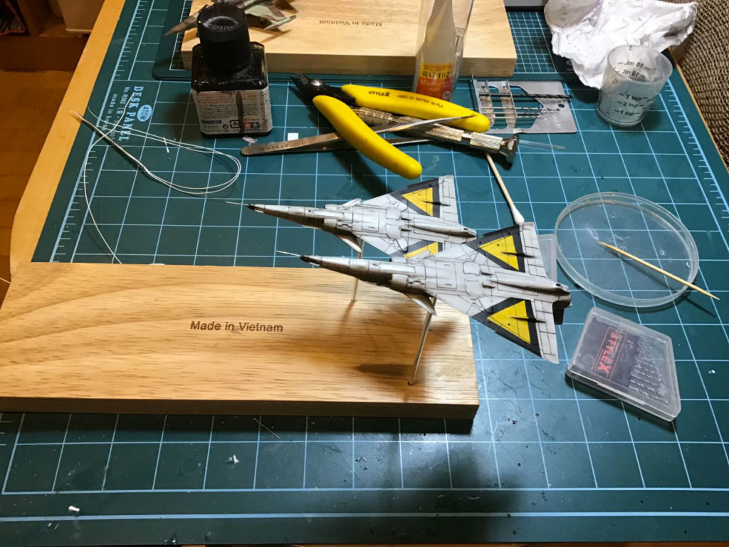 the Kfirs, being much newer kits went together well. The biggest problem with them was adapting to the idea that they would be displayed upside down. It seems like a small difference, but it can throw you off because things aren’t where they normally are. The only real issue with the Kfir portion of the build was the canopies. I’d heard about people cracking them, so I thought I was being careful. But not careful enough, I guess. The other issue was really just dumb luck, in the scuffle where I lost the front windows, I somehow managed to graze on of the Kfir wings with the soldering iron, talking a melted chunk out of it. Oh, well, battle damage… right?
