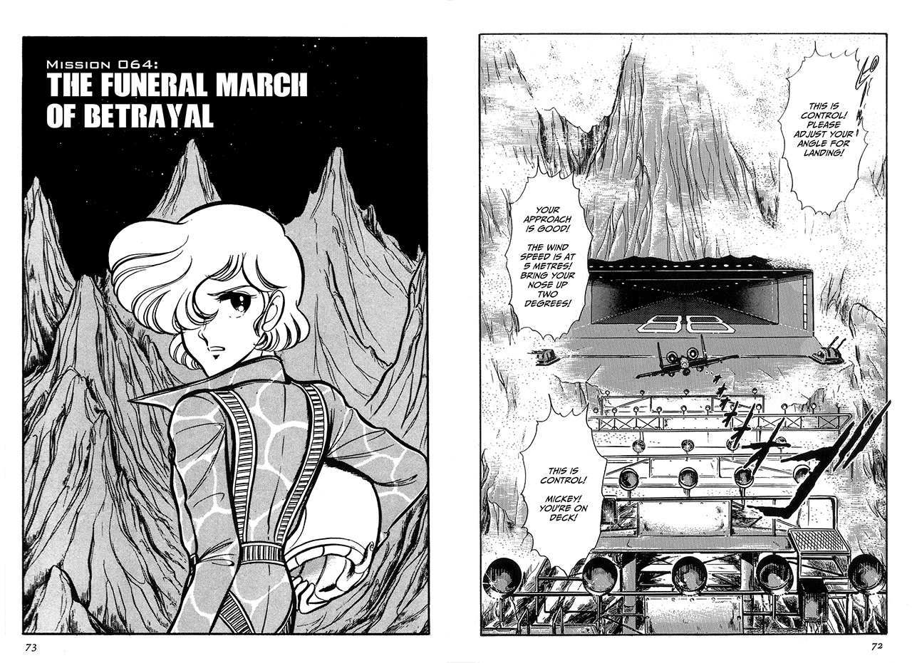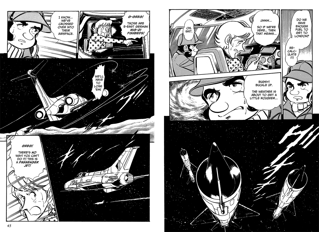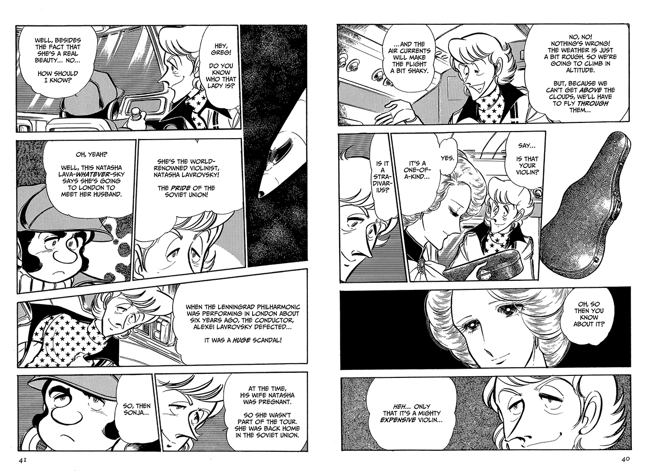 Back before becoming a mercenary and joining Area 88, Greg and Bugsy – having both been dishonourably discharged from the Danish Air Force for a “misunderstanding” – are running a “Defector Taxi Service” to assist people seeking to escape from behind the Iron Curtain. Operating under the call sign “Blue Cheese 7”, Greg takes on a contract to smuggle the famed Soviet Violinist, Natasha Lavrovsky, and her six-year-old daughter Sonya to London to be reunited with her husband Alexi – a former Soviet symphony conductor who had defected just before Sonya’s birth.
