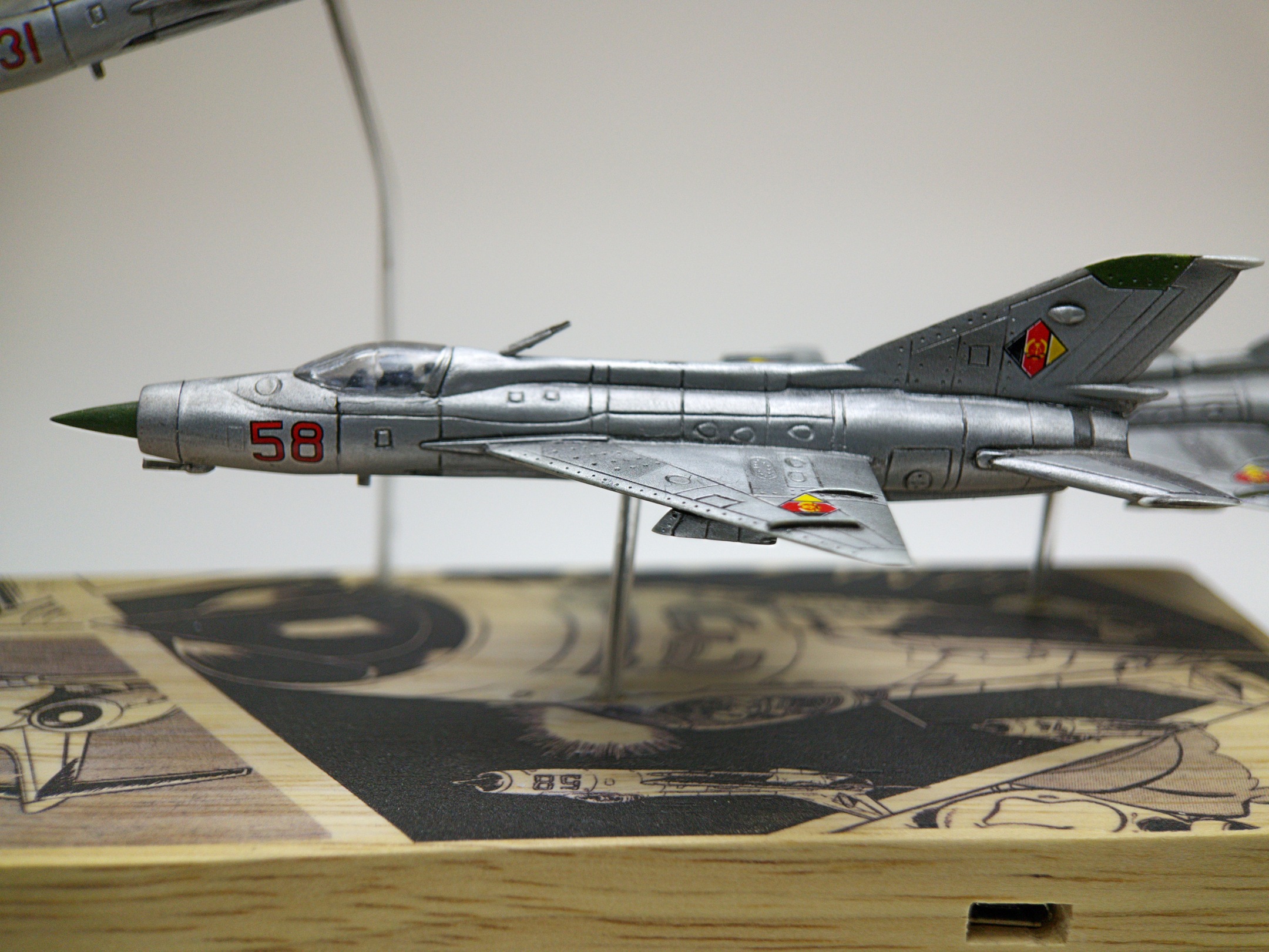 Besides adding my “signature” orange LED afterburner lights, the only real modifications I made to the kit were the nose cones. There seems to be some debate as to the authenticity, but for my builds, the manga is king, so I decide to elongate and sharpen the nose cones. I did it by basically drilling out the intake and then using the tips of the (unused) missiles that cam with the kit. I think it really gives the MiG-21s a much more menacing look. The main issue with the build was me trying to mask and paint the numbers. It really seems like it should work… they’re basically just blocks, but getting the numbers to look right at 1/144 scale seems to be beyond my current skill level (or maybe just patience). In the end I had to settle for some (admittedly very nice) decals from Mark I for the Soviet AF numerals as well as the East German Air Force Insignia.
