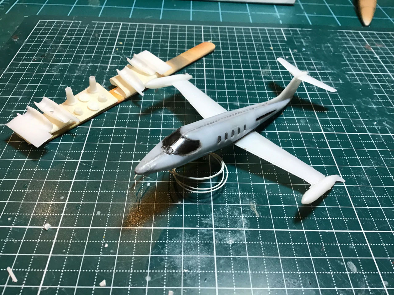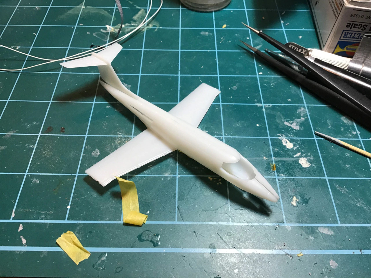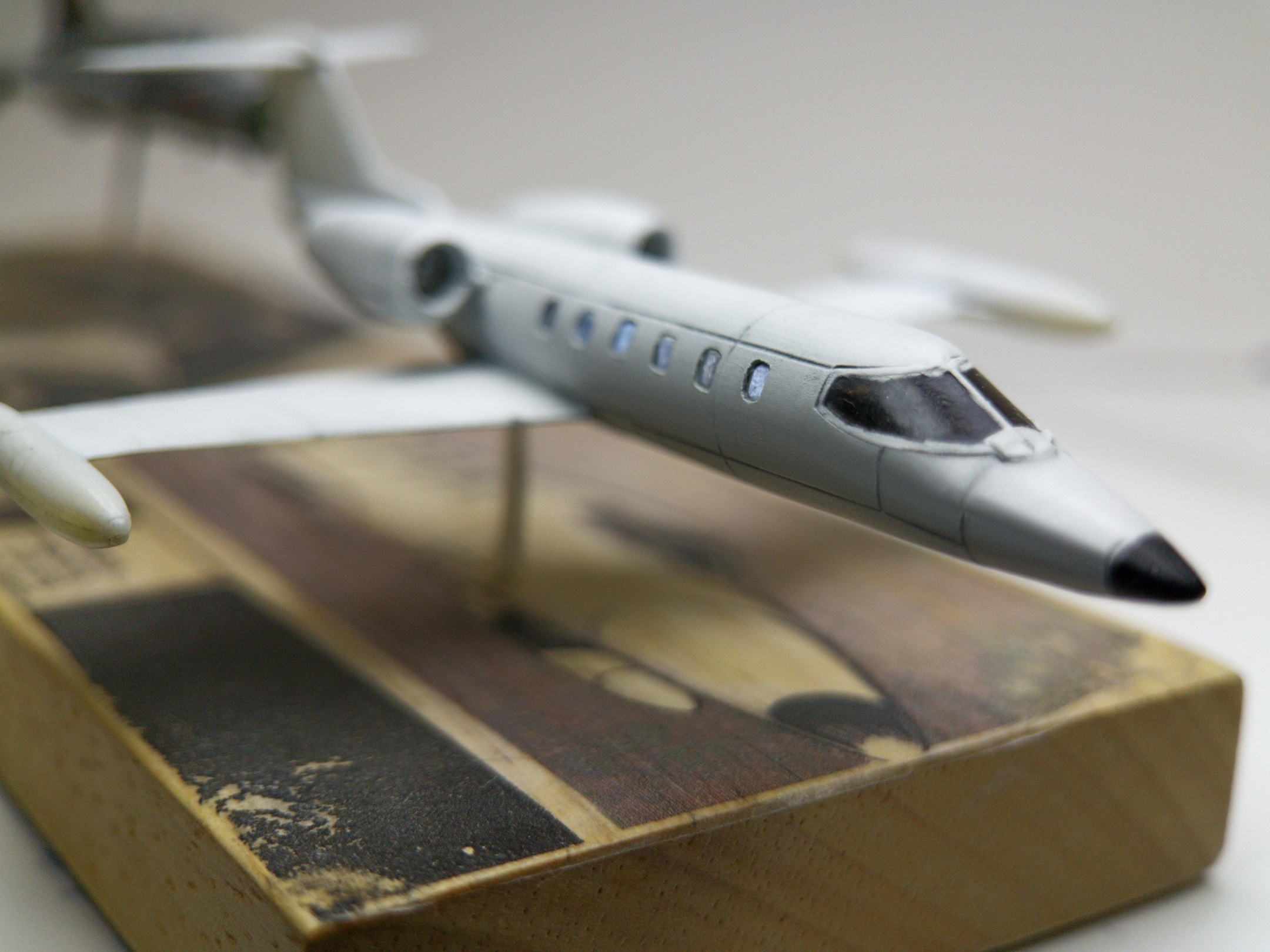 The Learjet presented a bit of a different challenge. It’s not really a tricky kit, but because I wanted to add lights to the interior, the translucent white plastic was really against me. I tried painting the interior with a dark metallic (i.e. reflective) paint job, but it just didn’t quite block it enough. So I resorted to stuffing the interior with thin aluminium foil to get the job done. It worked, but it made getting rid of the seams a bit of more a chore than I think it should’ve been. I also had a bit of trouble with the windows. The holes aren’t pre-cut, so it’s quite tricky to get them shaped properly. Those side windows are tiny, and the tolerance to get them to fit is thin. As if that wasn’t enough, the cockpit window just didn’t want to sit nice and neat. There’s a lip that should hold it in the correct place, but it just ended up being more of a pain than a help.