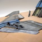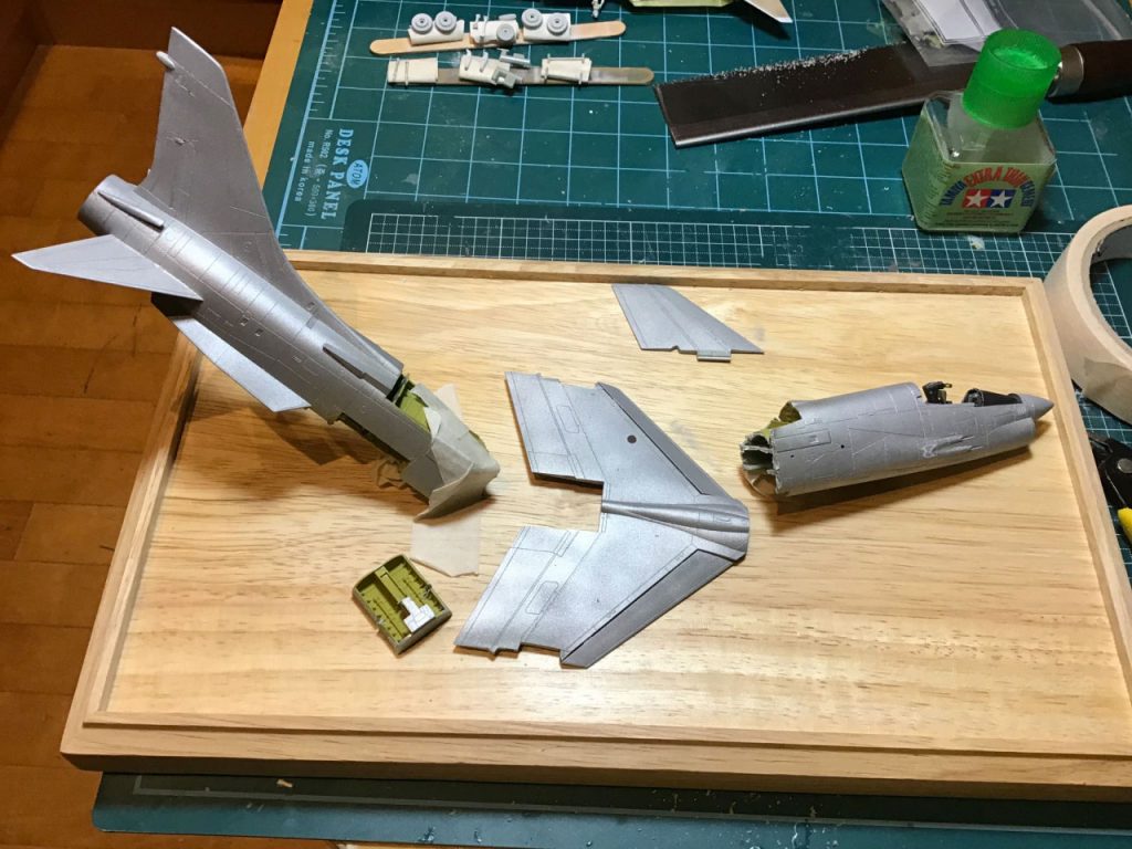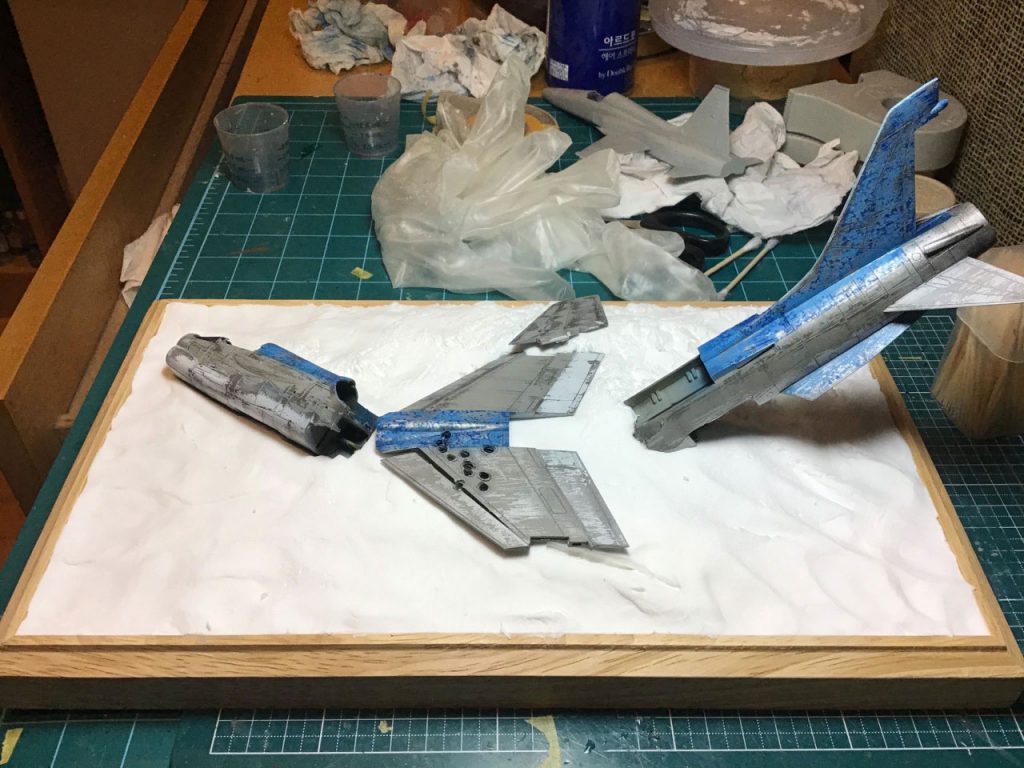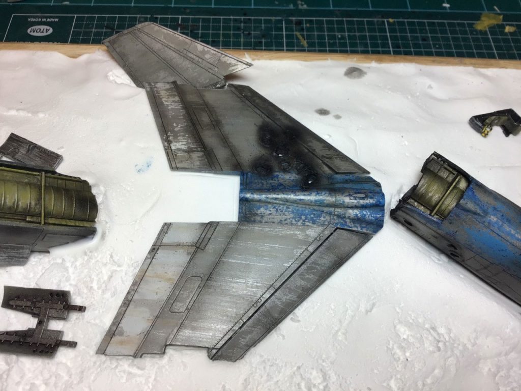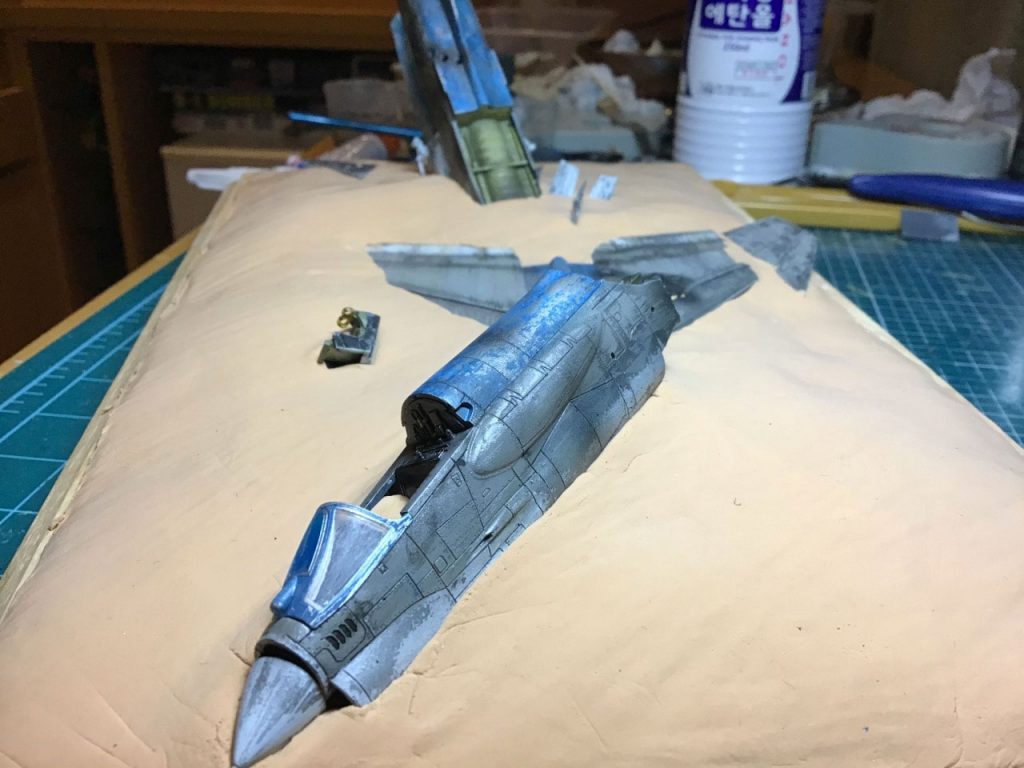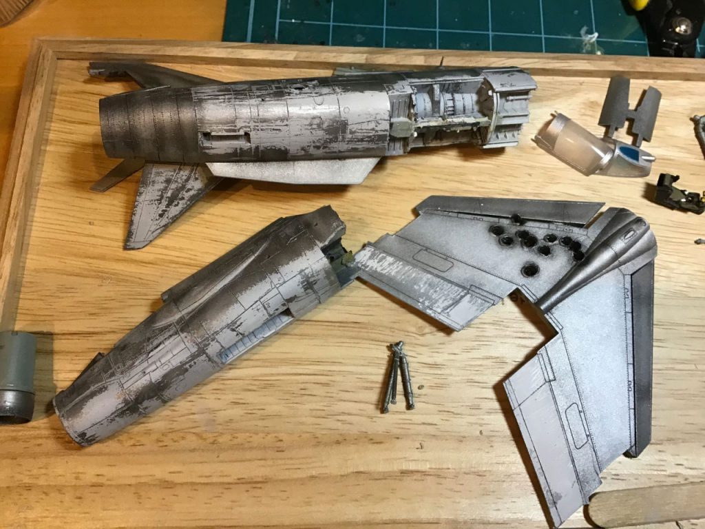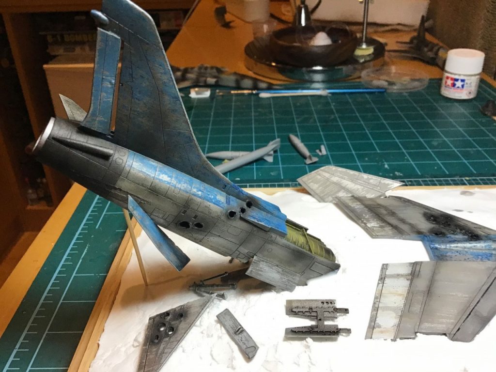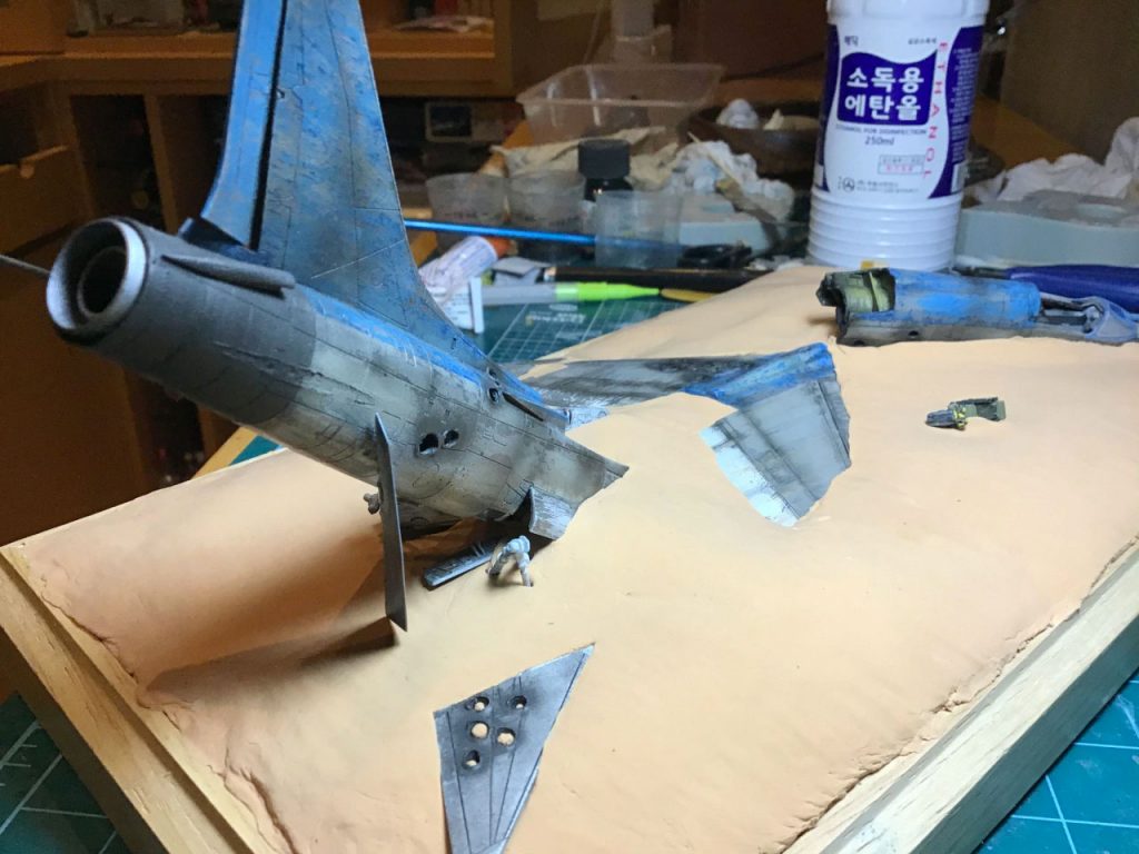 The first thing I needed was a proof of concept, so I hacked up the already disassembled fuselage of attempt 2 and placed it in the rough shape of crash site. It looked do-able, so I got to work. First I sawed the already built F-8E fuselage into two main parts, separating them at the same point they are in the manga – at the beginning of the wing, just behind the cockpit. Then I used my soldering iron to poke some pretty massive bullet holes through some strategic spots – also doing my best to mirror the exchange depicted in the manga.