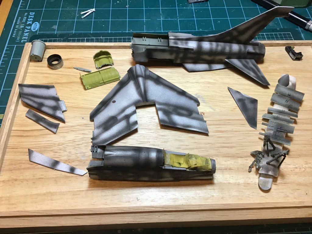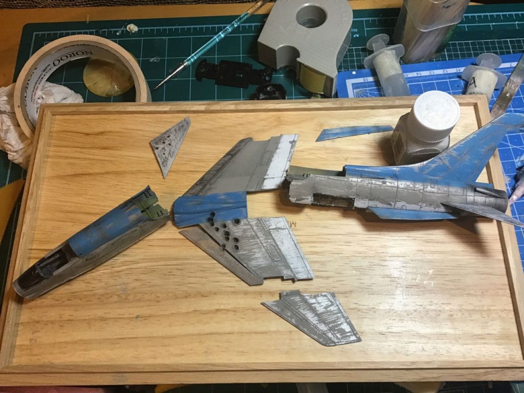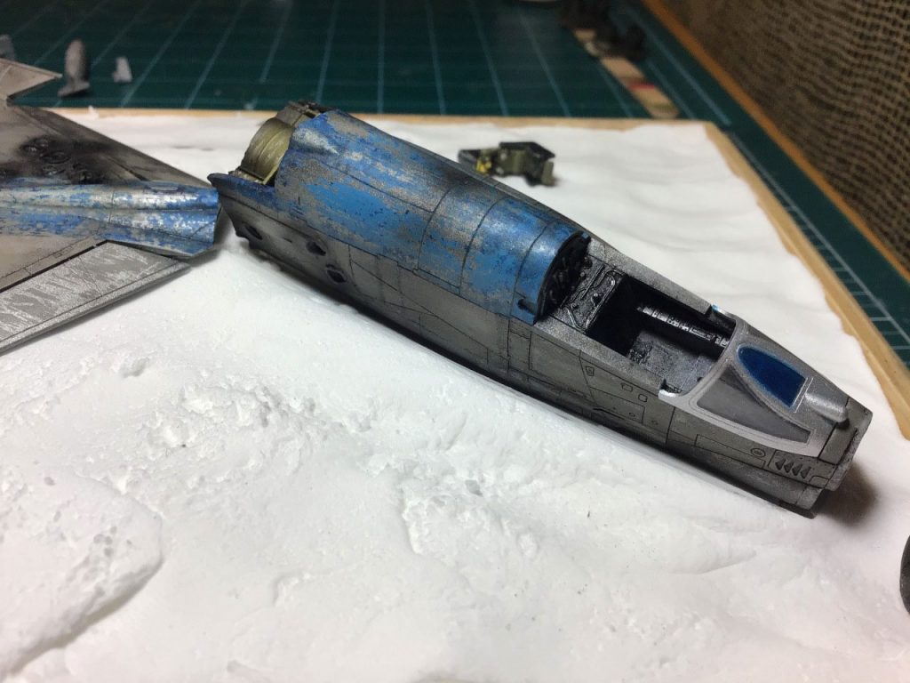 After that I did a series of washes using black and sand coloured paint to add some texture to the beat up paint job. I also took some guilt pleasure in scratching the hell out of the inside of the clear canopy… MORE SCRATCHES!