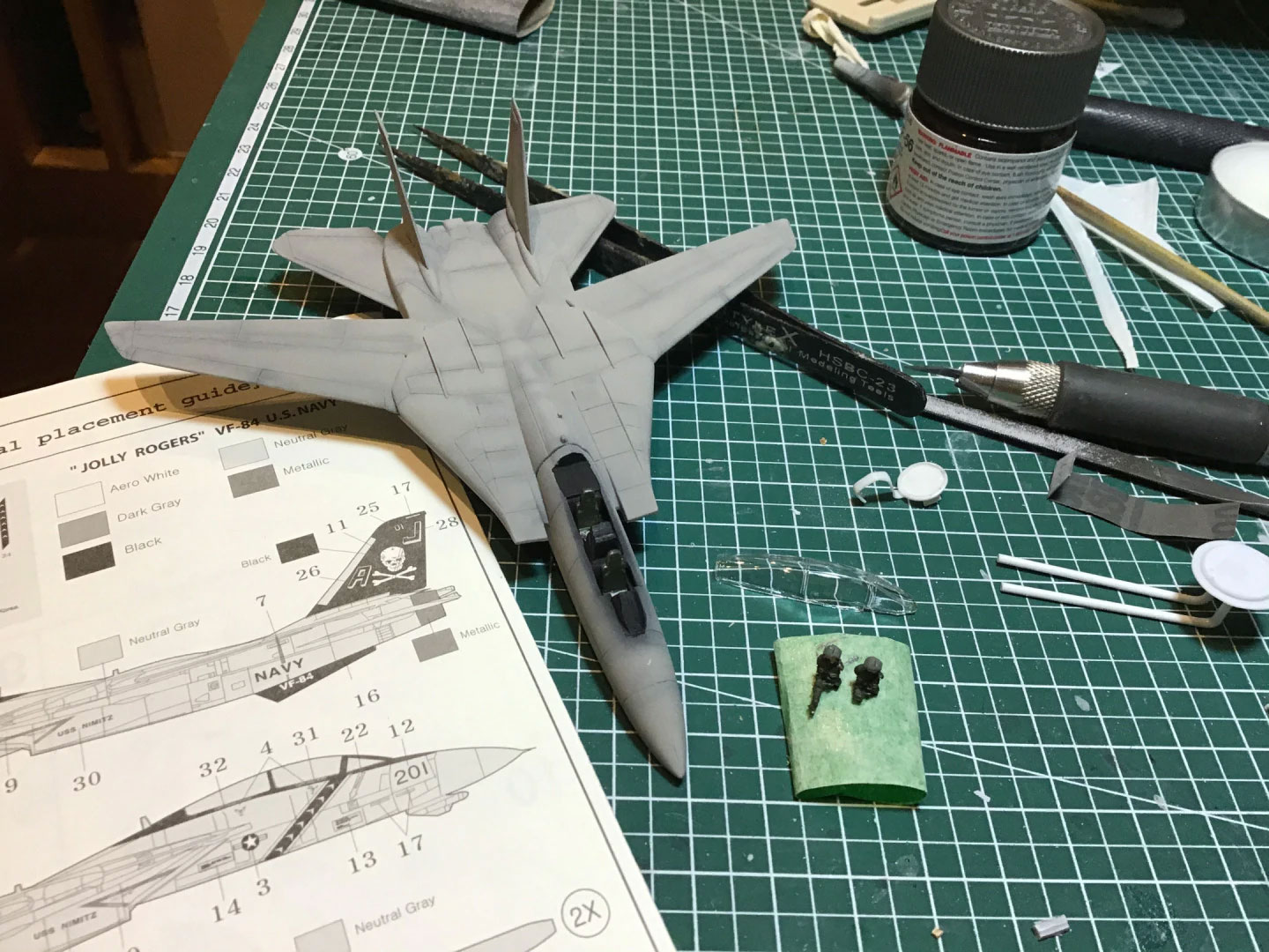 The fact that I have so many 1/144 F-14 kits gave me a lot of leeway in terms of mixing any matching the plastic and decals. Although this kit is an Area 88-branded Hasegawa reboxing of the Dragon F-14A tool, the plastic isn’t nearly as nice as the 1/144 scale Revell F-14. Since I’ve got a couple of Ace Corp. reboxes of those, I decided to slot those in for Mickey’s F-14A. The F-14A will make an appearance (mainly just the nose cone) alongside a C-130 as part of the “McCoy Express“ project, and the other “Black Bunny” one will go head-to-head with Gary MacBurn’s MiG-21 in “The Final Showdown – Part 2”. So the decals from the Hasegawa box will match up with the Black Bunny project. Those decals will slide over into the Ace Corp F-14A box, and the Ace decals… ended up here. Which is handy, because they’re more or less exactly what I needed.
