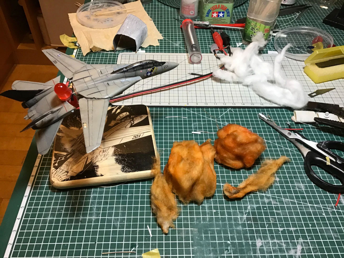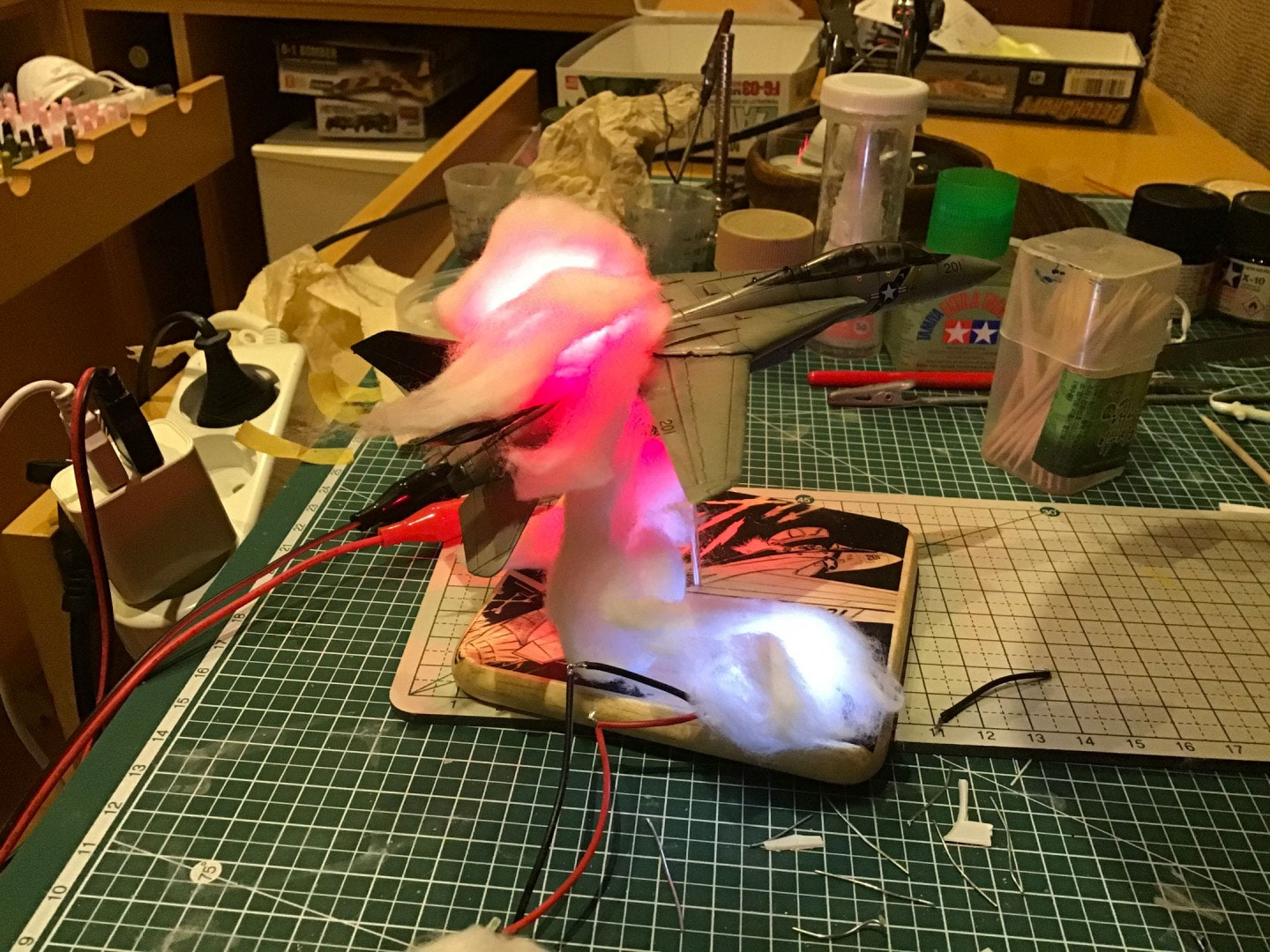 It was a bit unnerving to meticulously build the kit to completion, and then take a saw and hack it in half, but I’m glad I did. I tried the “explosion mid-flight” idea with an F-111 Aardvark in my “A Dill Hill to Die On” project, but this one worked better in my opinion. In fact, I’m surprised at how fast it all came together at the end. After it was in two halves, I added a bit of wire to the interior to provide the shape and support the structure. I slid the LED lights in and glued them in place and then I got out the cotton.