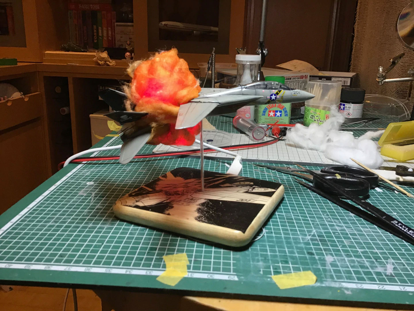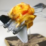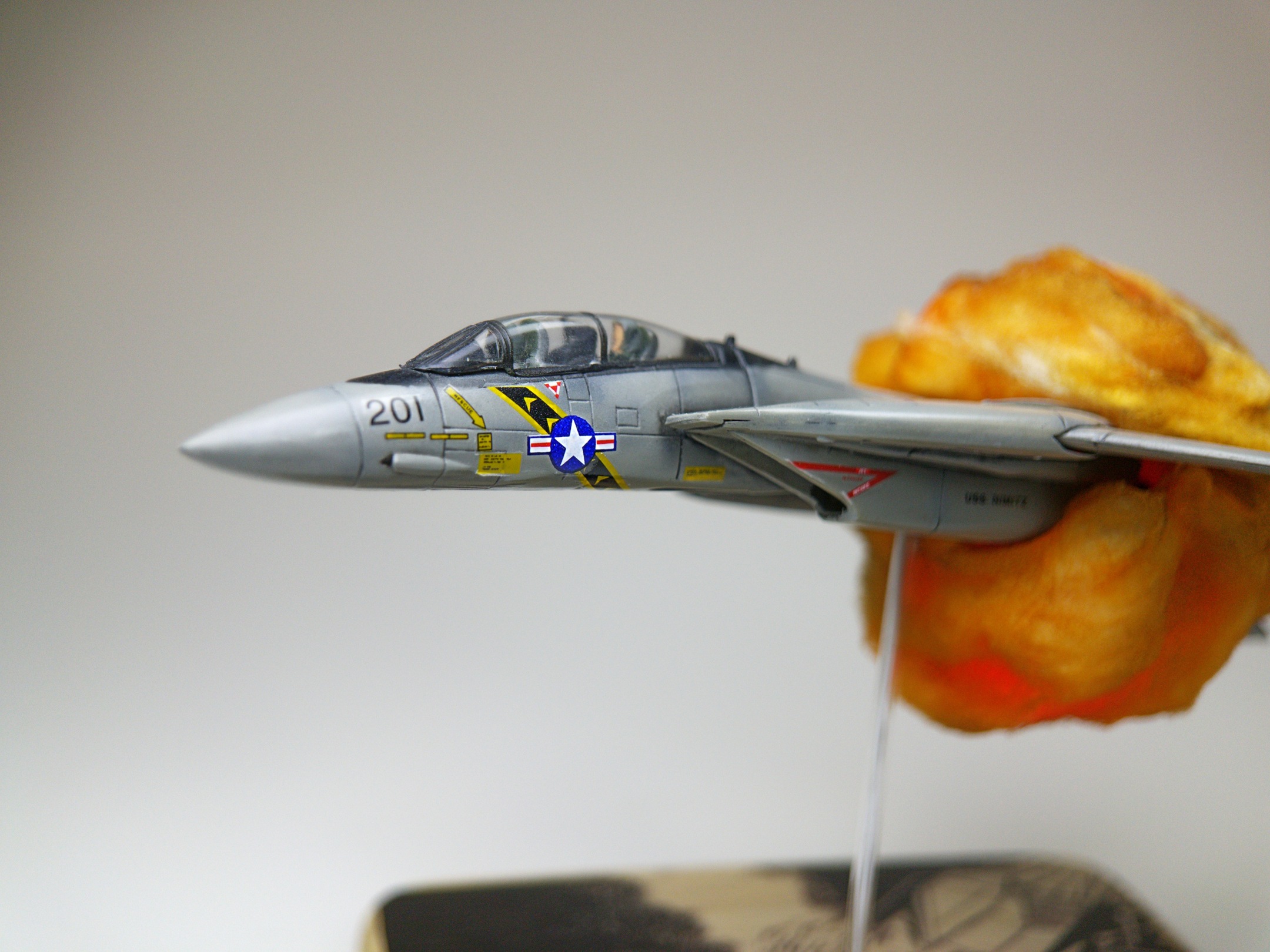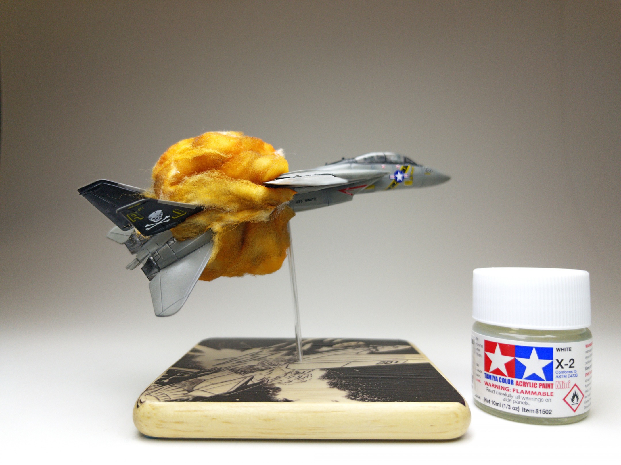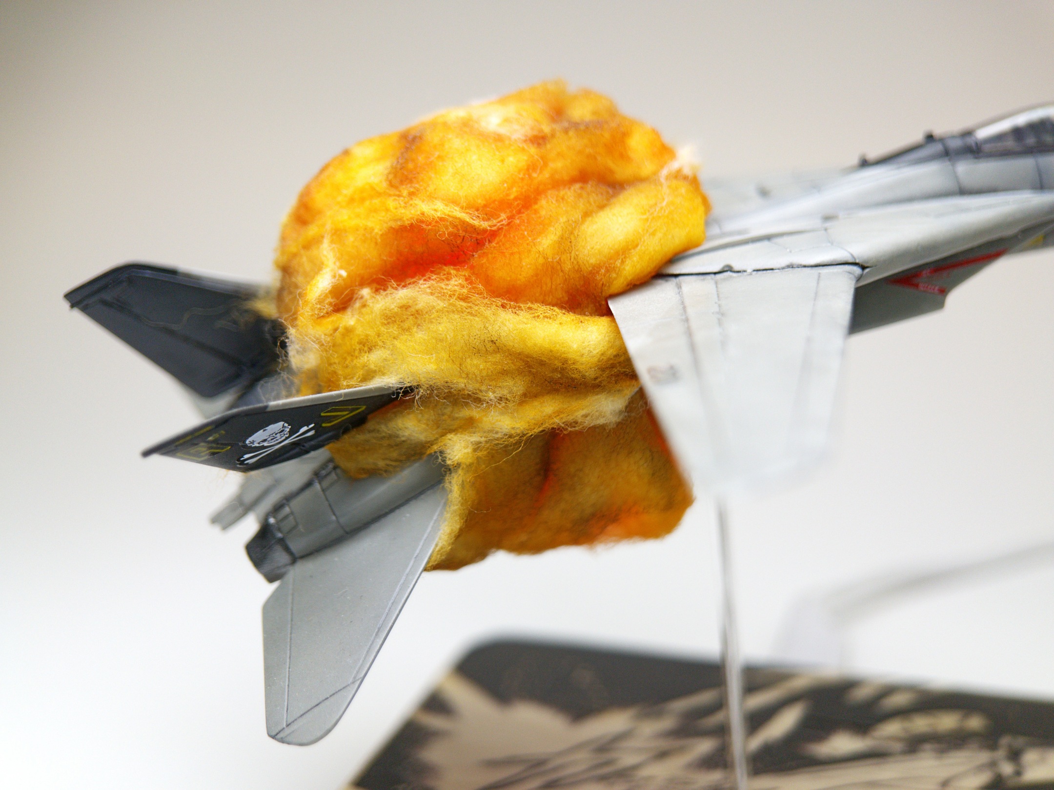 A few deformed cotton balls, some cheapo hairspray to make them hold their shape, and some Tamiya X-26 Clear Orange (and a touch of X-19 Smoke) and we had explosions galore. It was a bit sticky to attach them to the model using white glue, but I find that works the best.