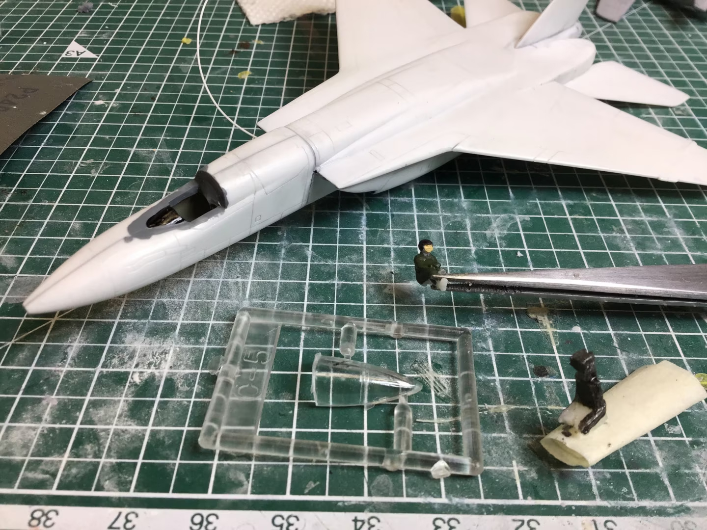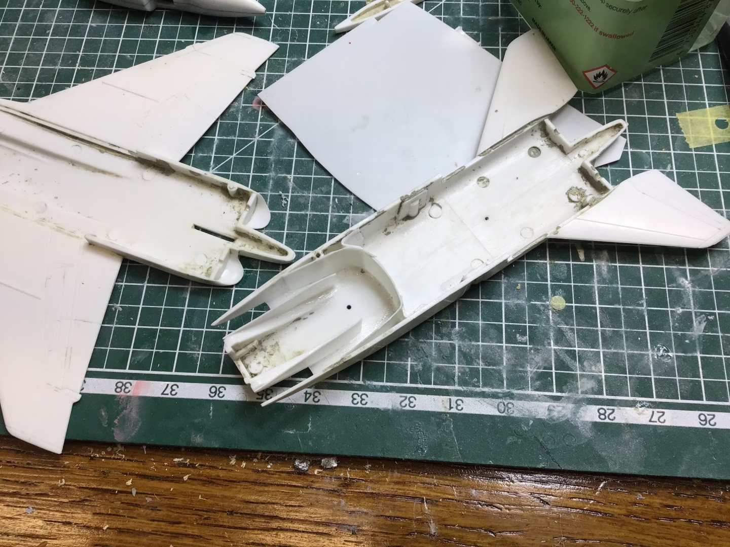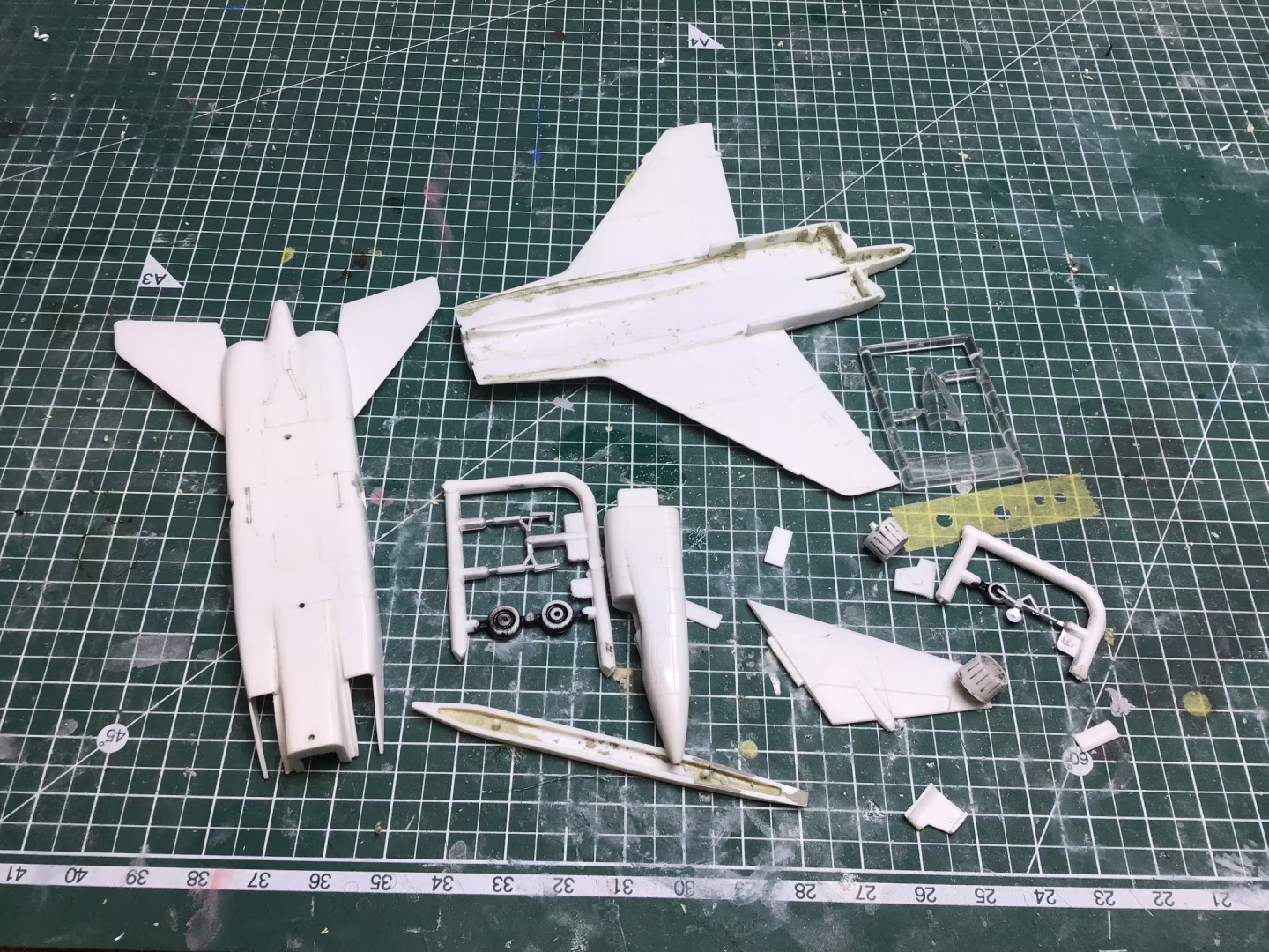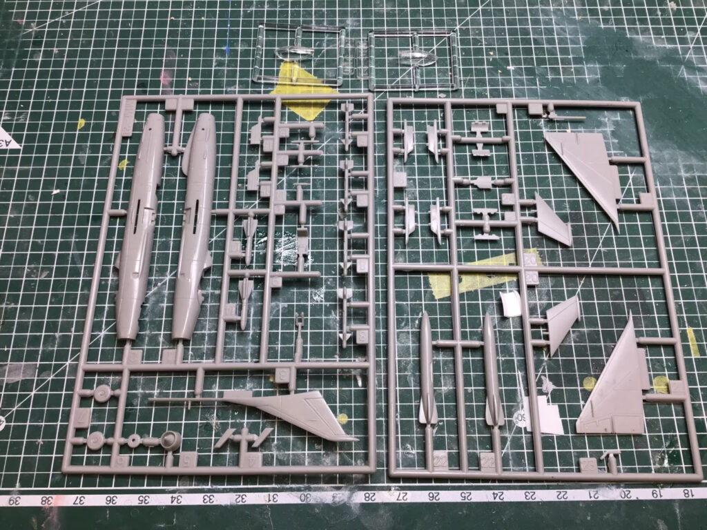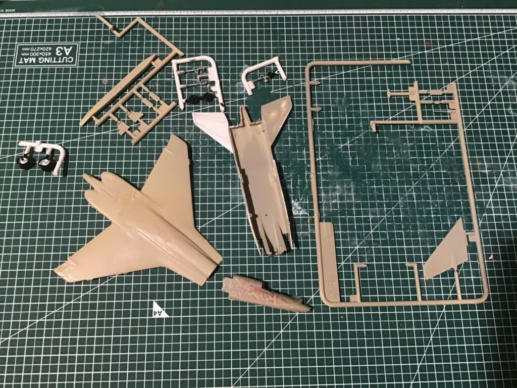 The story of this build is really before I got started. When I opened the box, I wasn’t quite sure what I was looking at. The plastic on the kit looked almost melted, in that rounded blobby and cracked sort of way. It was also a very odd “left out in the sun too long” shade of beige.  So I wasn’t at all sure I’d be able to salvage it. Luckily… I had a clue. On one single part of the tail section – the underside of one of the rear elevators, the plastic looked undamaged. I then started to suspect that it might be a strange coat of paint on the kit that was causing the horror.