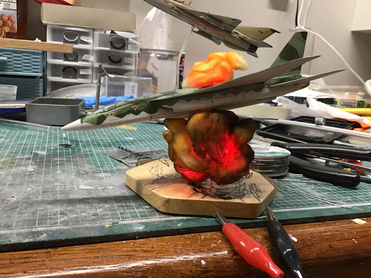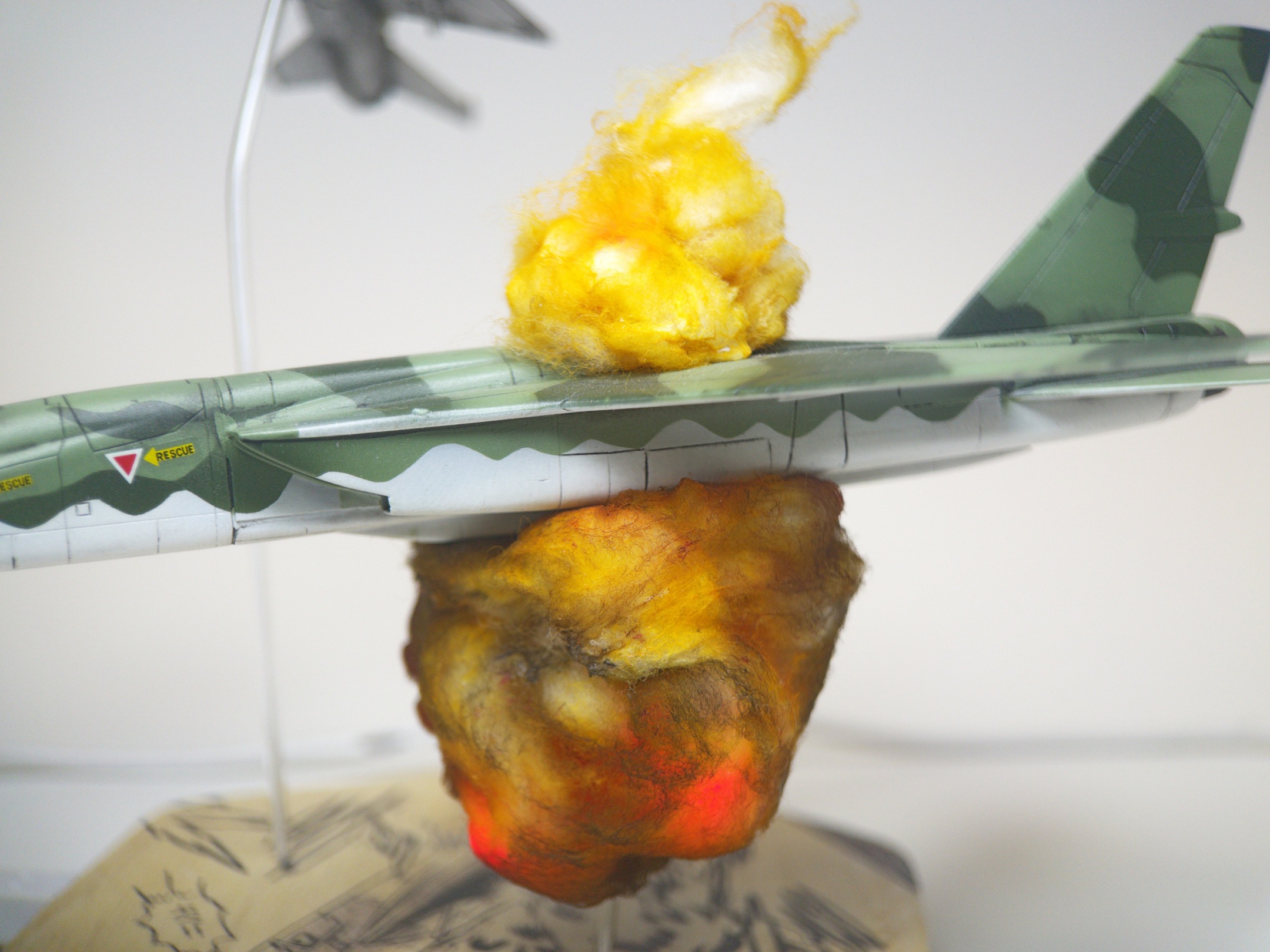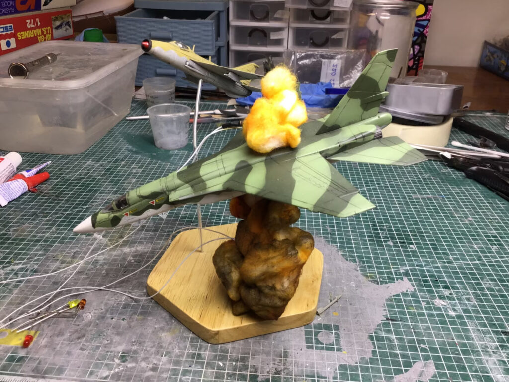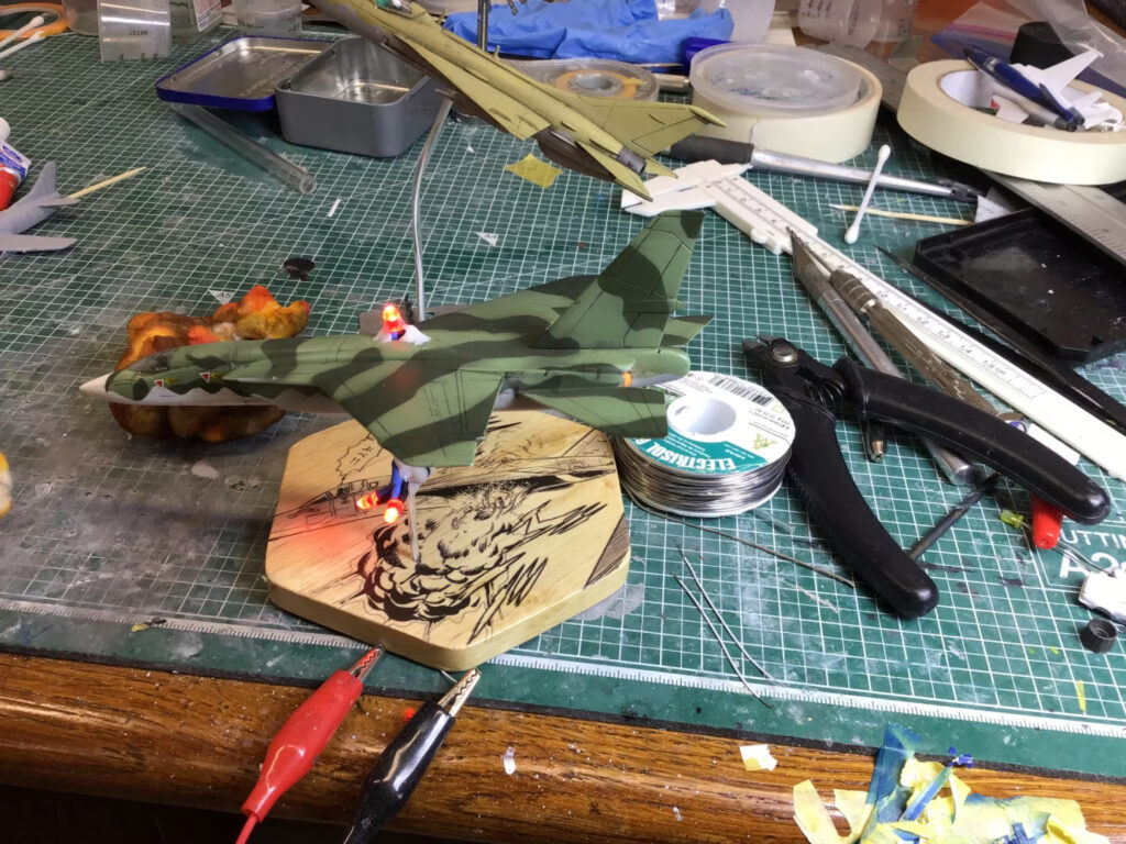 After that, it was reasonably straight forward. I knew I wanted to “blow this one up” like the scene in the manga, but I decided to follow the familiar path I’d carved out on my “Friendly Fire” and “A Dill Hill to Die On” projects and build out the plane nicely before creating the explosions.  That did give me a bit of trouble with the wiring, as I hadn’t really left enough slack in the internal wires to tap into to add the LEDs for the explosions, but with some very careful soldering, I got it done.