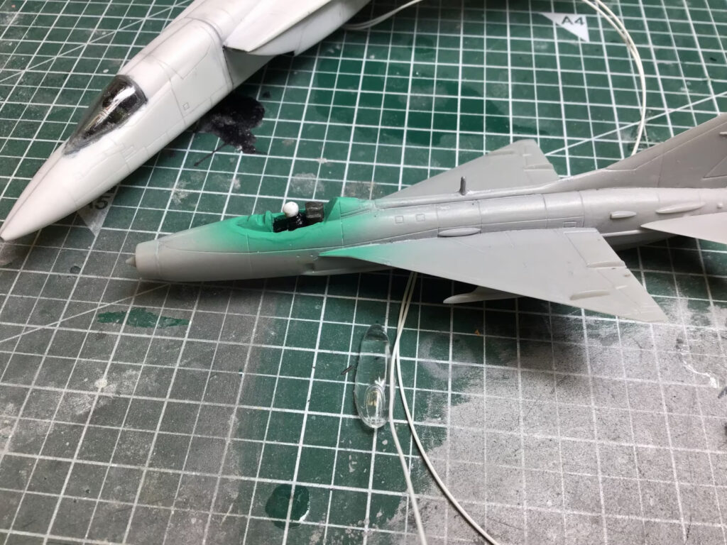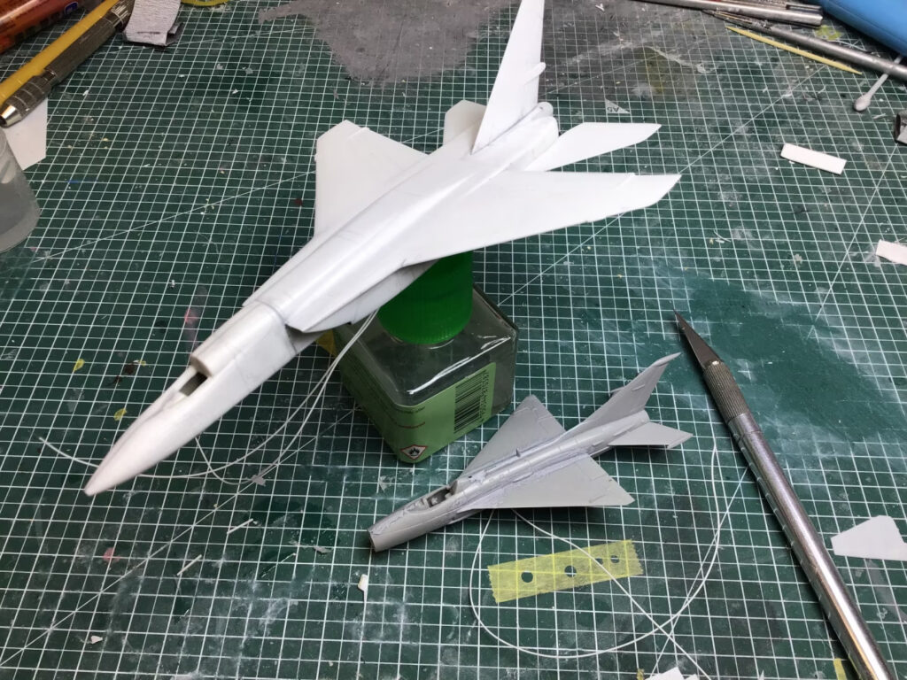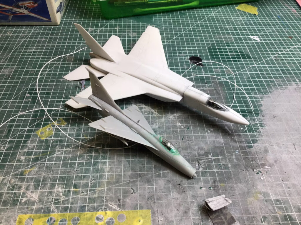 I also debated with myself on which MiG-21 kit to use. I’ve got some of the very nice Eduard ones lined up for some future Project 4 builds, where they’ll be the star of the show. I’ve also got some not-so-nice kits like the Airfix/Academy/Mini Hobby ones (all descended from the Crown original) that I’ve relegated to cannon fodder – such as in my “Steinberger ’76” project. I do have a nice Trumpeter kit, that I used in my “Blue Cheese 7” project, but in the end, I stumbled across a “never before seen by me” boxing of the Tsukuda Hobby MiG-21 at the local swap meet. The detail was just enough (and not too much) so that it doesn’t look out of place next to the ARII RA-5C. Perfect!