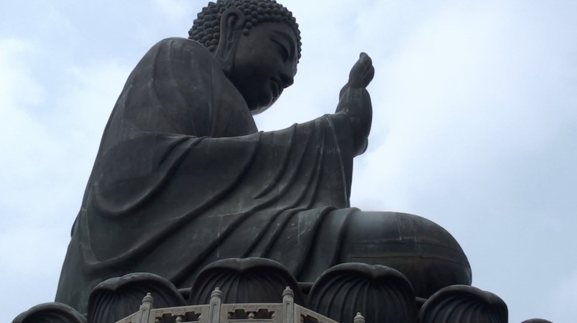 On our third day in Hong Kong we decided to venture even further and went to visit the Big Buddha on Lantau Island. Lantau Island is a ways away from downtown Hong Kong – almost all the way back to the Hong Kong International Airport. We took the MTR (Mass Transit Railway, i.e. the Hong Kong subway system) from Central all the way to Tung Chung station and I was surprised at how many people… especially young families were getting on the train as we went along. It wasn’t until later that I realized that most of them were on a very different spiritual quest… they weren’t in search of enlightenment, they were headed to Hong Kong Disneyland! Of course we also got to go for a ride… on the Ngong Ping 360! The best way to get from Tung Chung to Ngong Ping Village (where the Big Buddha and the Po Lin Monastery are) is a 25-minute (5.7 kilometre) scenic cable car ride! It was simply lovely to float above the island, taking in the view of Tung Chung Bay and then seeing the Big Buddha get closer and closer!