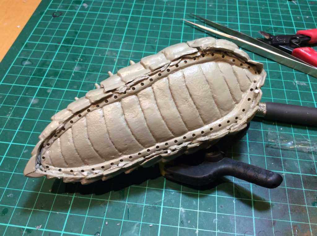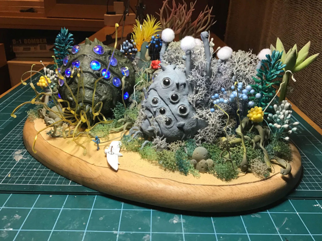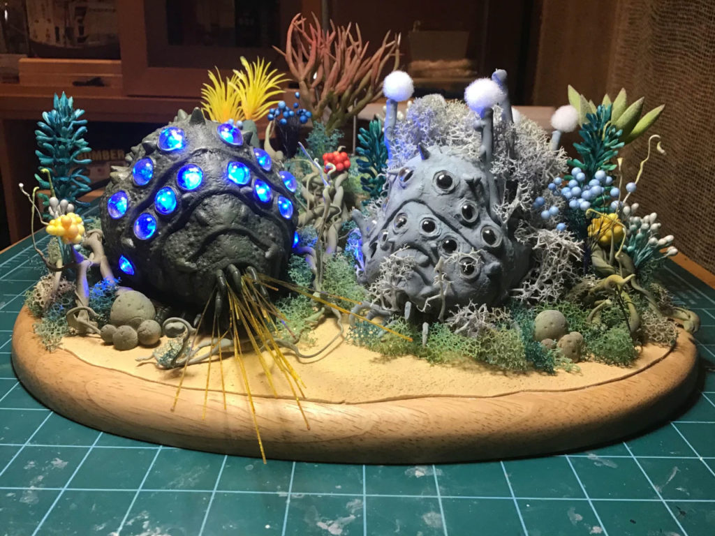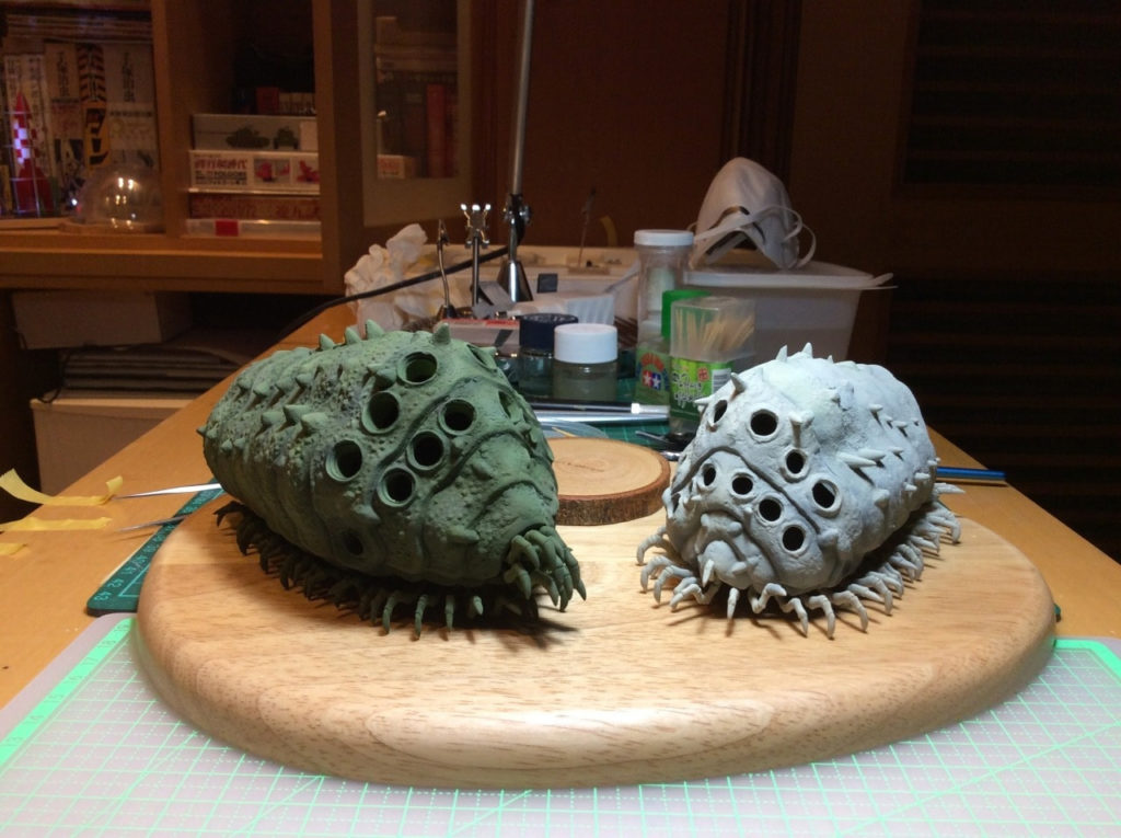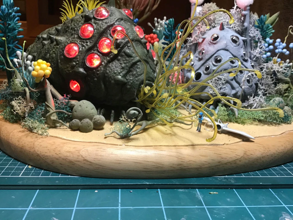 Once I had them side by side, I decided to depict a scene inspired by the opening scene. Given that the grey plastic of the Tsukuda kit makes the Ohm look dead (and not just a transparent empty shell), I decided to go all out with that concept. So I just adapted the elements of the empty shell, the live Ohm and the Nausicaa and the eye shield, and then mixed in the look of the spore-infested carcasses leftover after one of the Ohm stampedes. Besides, I’m pretty sure the scene LOOKS like it could’ve been pulled from the animated film or the manga, right?