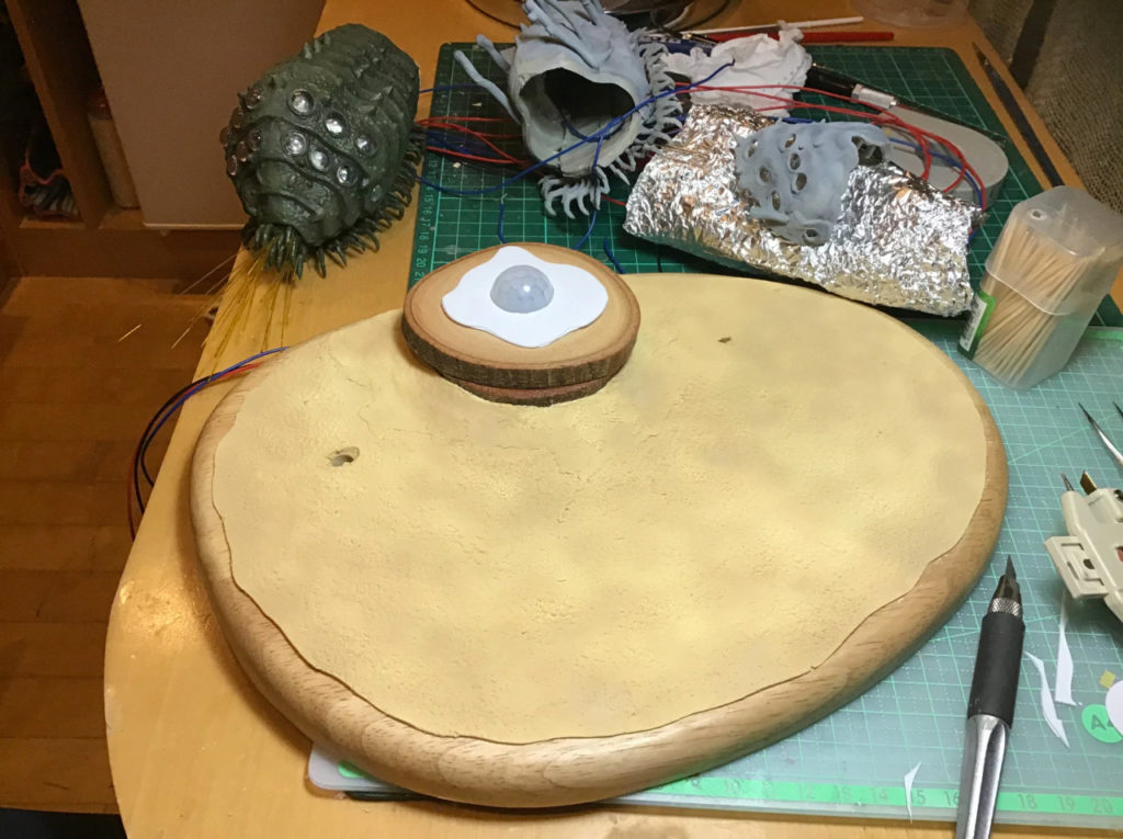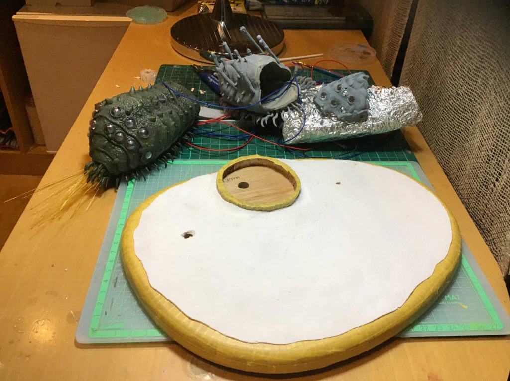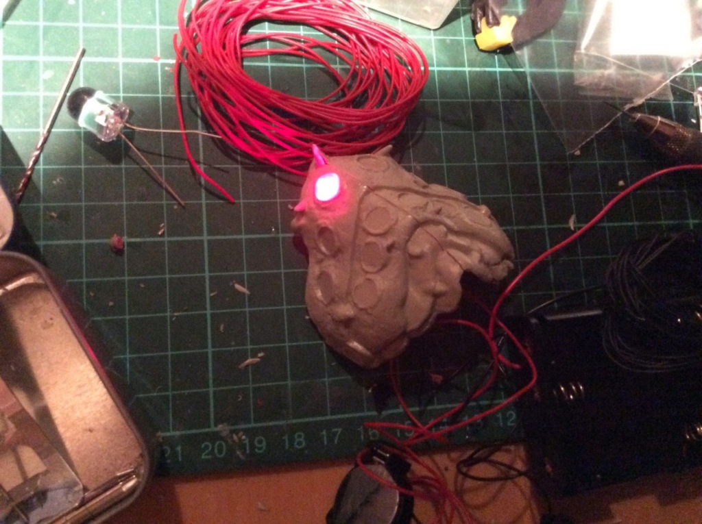 It was also a challenge to load the interior of the dead Ohm with enough aluminium foil to get the touch to work through the plastic. Too much, flicker flicker, to little… and nothing. I got it working but it was barely noticeable, so right near the end of the project I tore out the fibre optics, added a transparent backing to the “mouth section” in the hopes of getting more light to pass through there, and reformed the yellow feelers out of heated/bent 1mm transparent polystyrene rods. It didn’t work any better, but the organic twisting made it LOOK a lot better, so I’m happy enough.