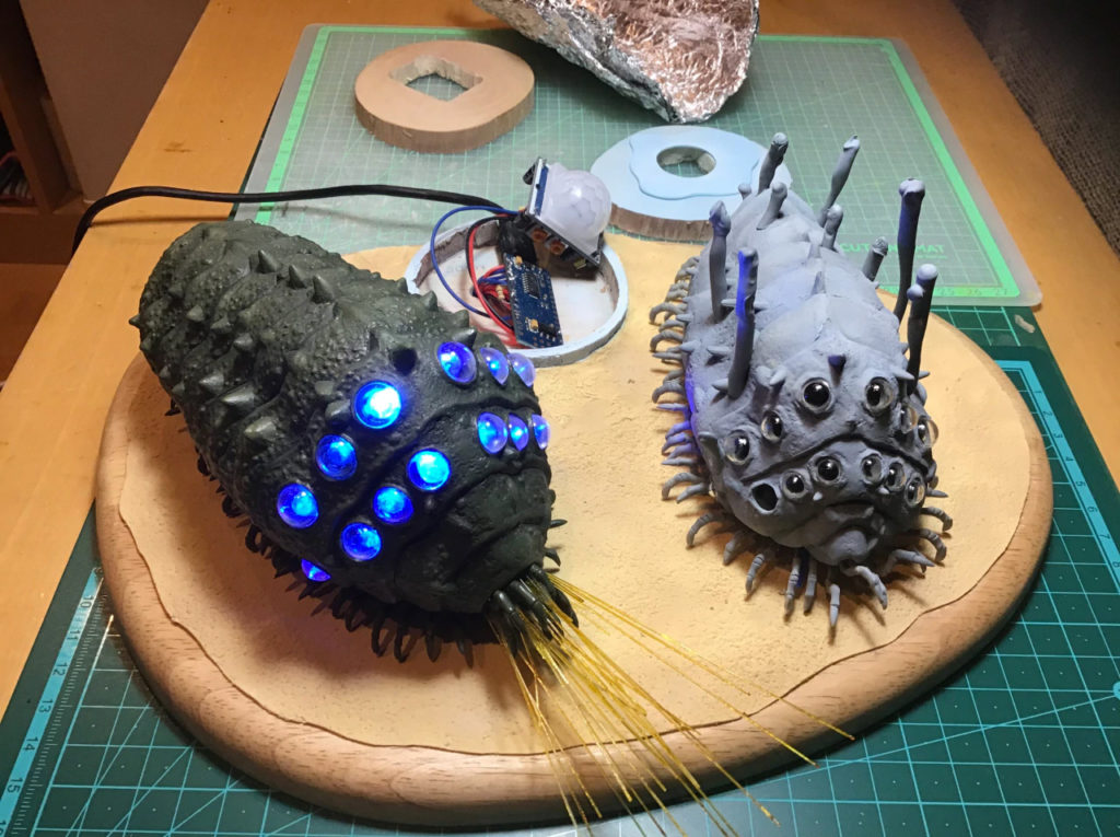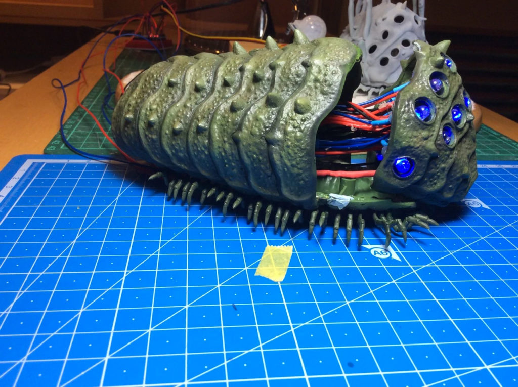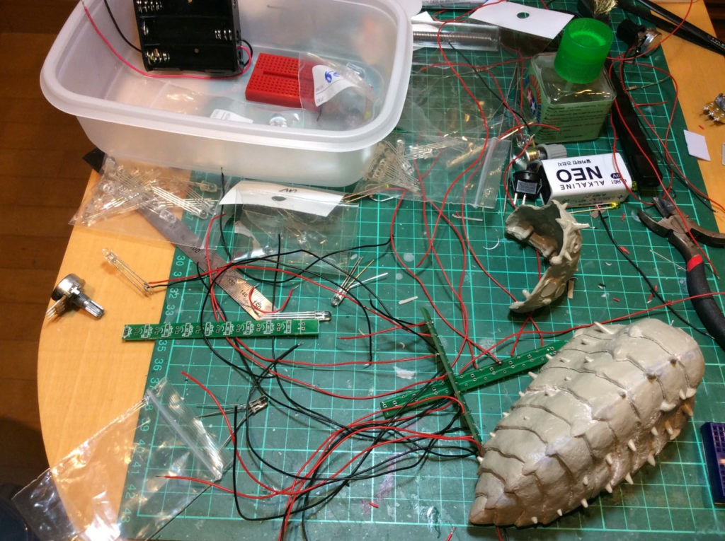 Fourteen eyes is a lot of light bulbs, even if you’re using RGB LEDs to accomplish it. Part of the challenge was figuring out how much electricity I could put through the Arduino without frying it. Once I got that down, I also needed to get the motion sensor to trigger the colour shift. I also included a capacitive touch sensor that should let you light up the Ohm’s yellow feelers with just a touch. I thought I was being smart by using a “dollar store” fibre optic lamp as a resource, but I couldn’t get the fibres to bend without destroying the internal light-shaping structure and rendering them “dead”.