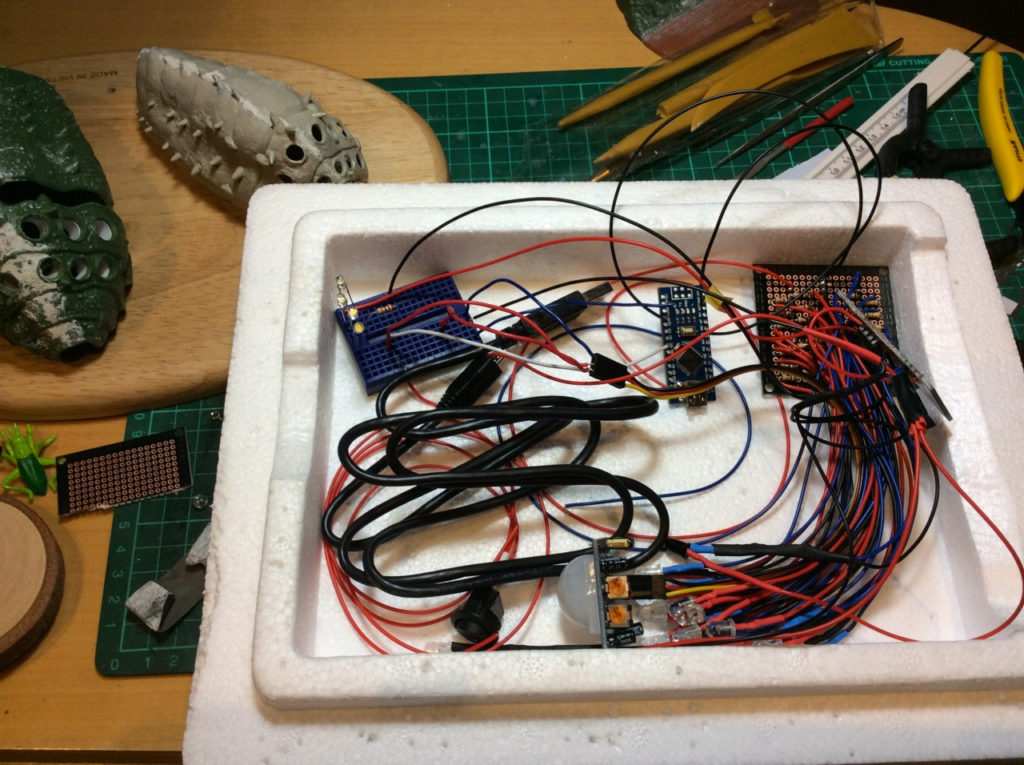 After the shells were put together, I turned my attention to the electronics. I saw a video on YouTube of an Ohm with flashing Blue/Red eyes that changed with a proximity sensor and I just had to include it. I used a Arduino Nano microprocessor to handle it, so writing and testing the code took some doing.