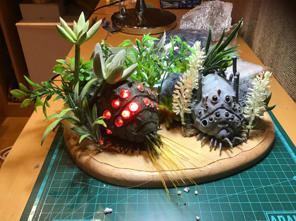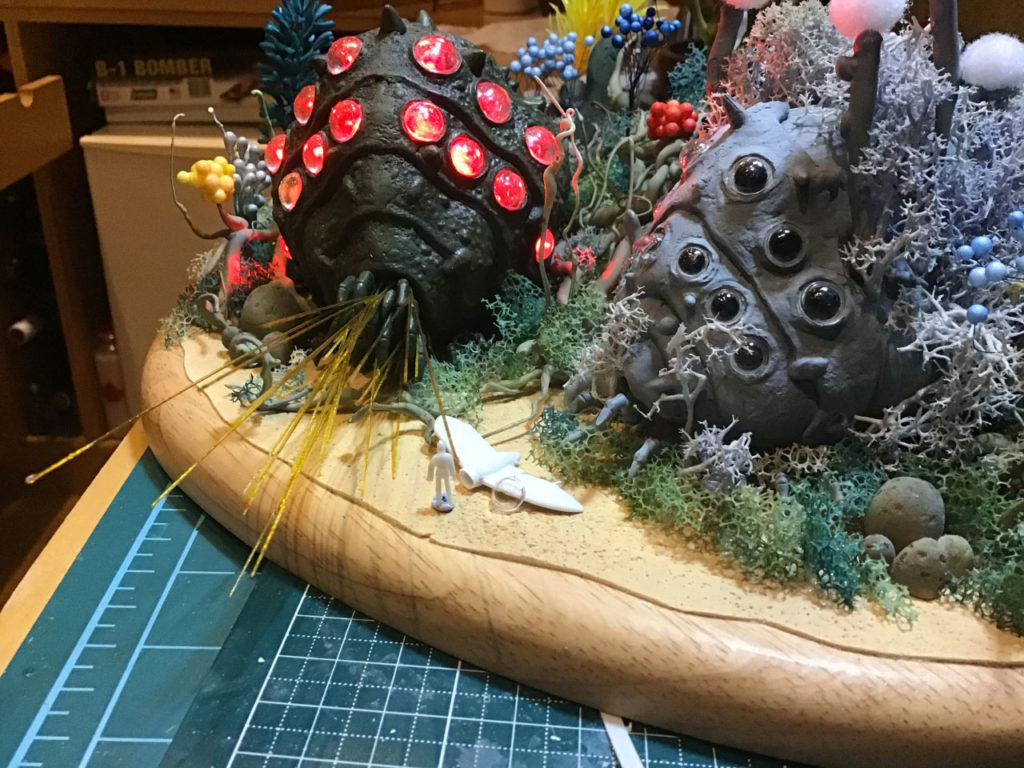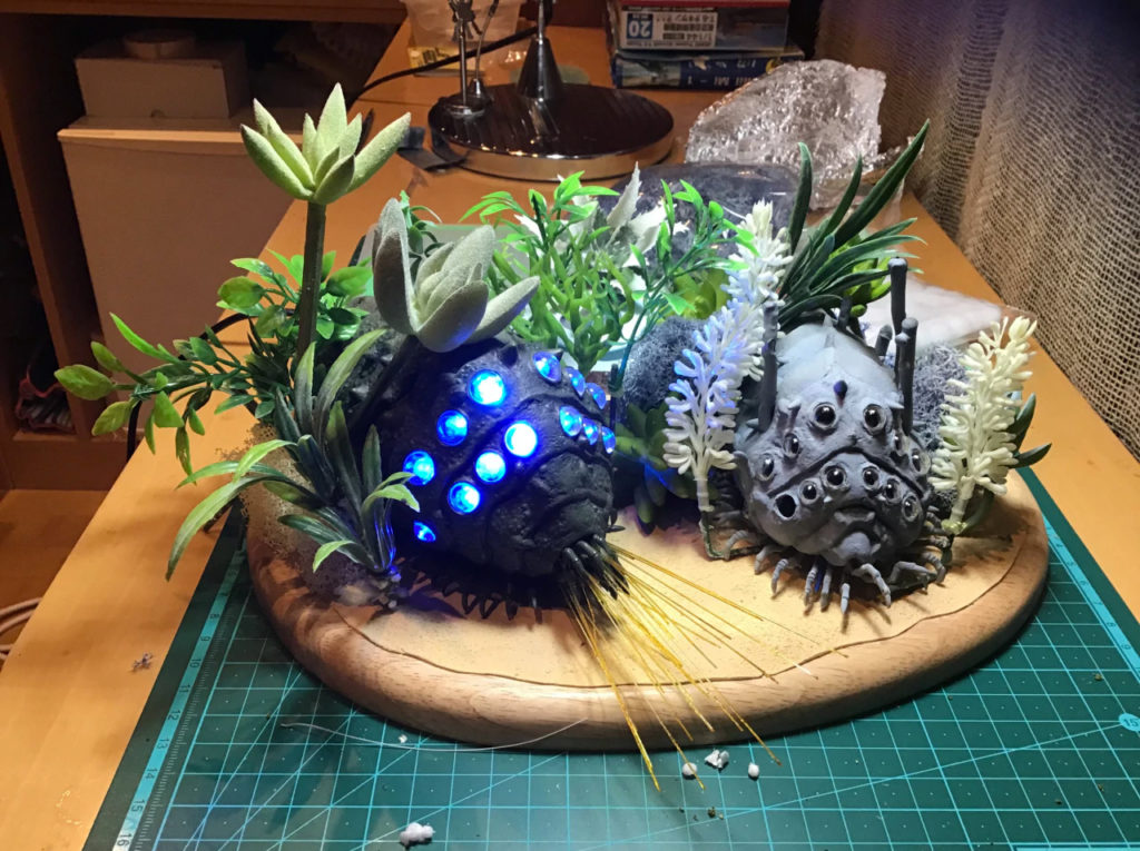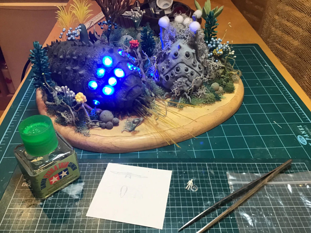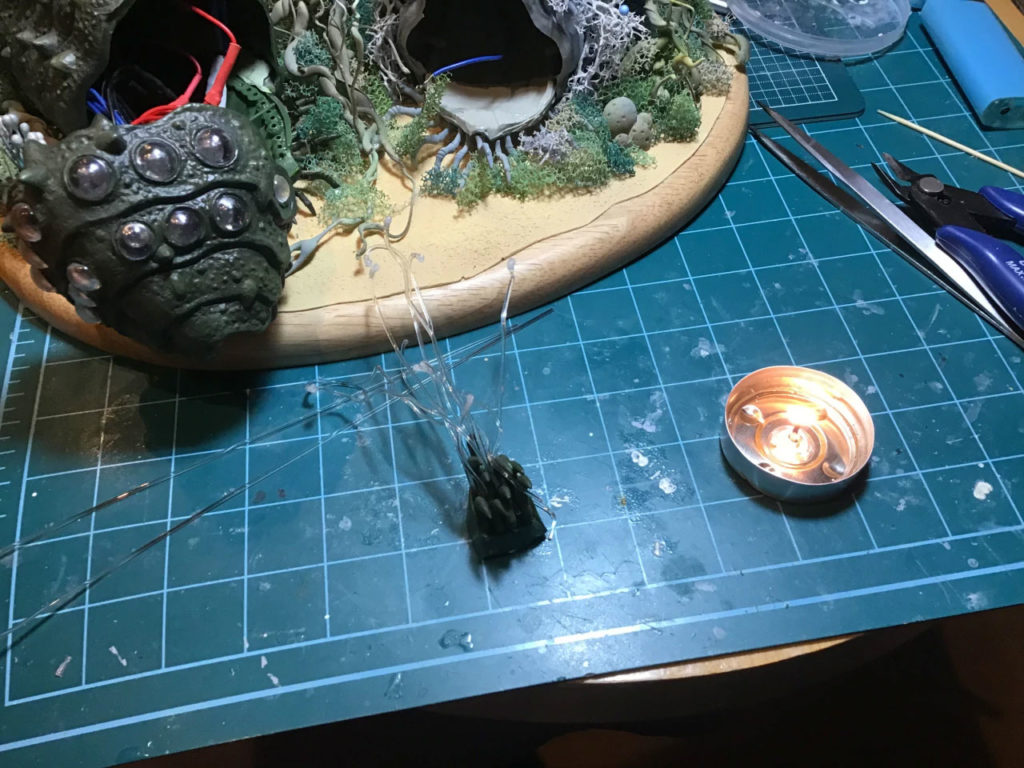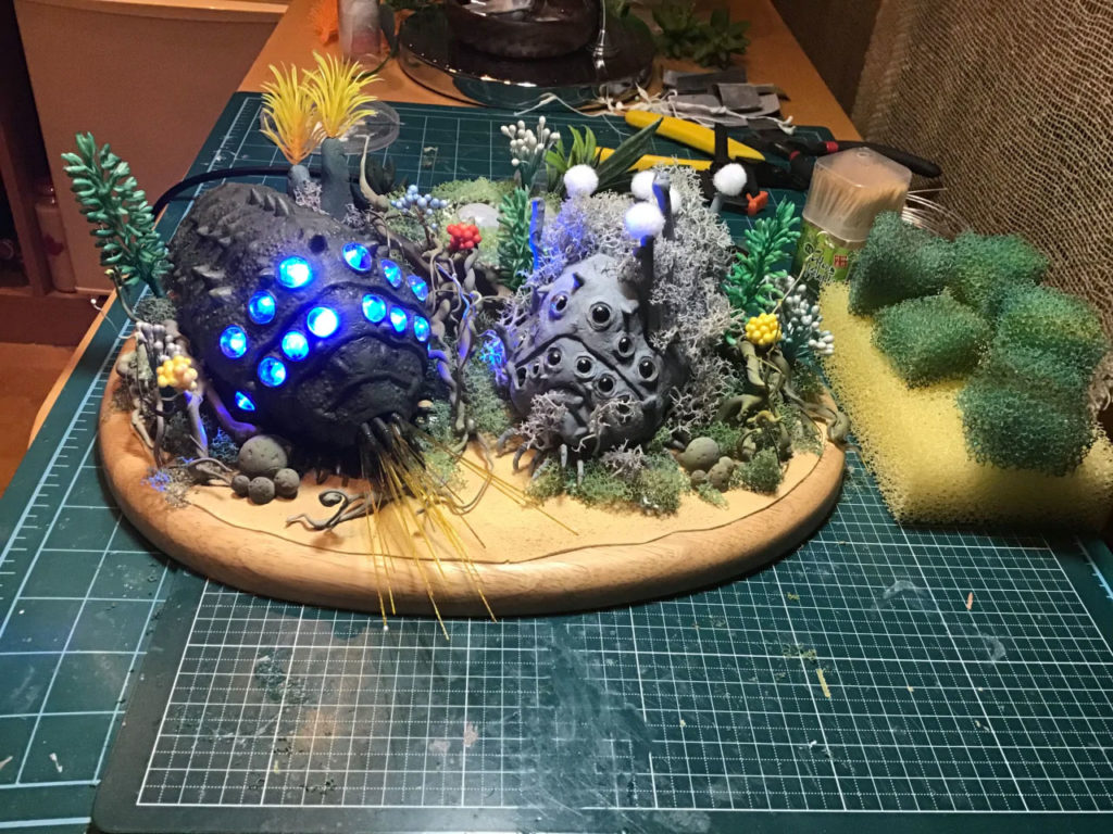 If you’re going to put together this mass of electronics in a model, you need a good place to hide them. So, after securing a wooden serving tray from the local dollar store and flipping it upside down, I used some textured and painted “angel clay” to added a “sandy” ground. I bought a bunch of plastic plants from the dollar store as well, but the look was more “Mrs. Brown’s 4th Grade Class Terrarium” than “Sea of Corruption”, so I started making my own flora and fauna. I stretched and pulled some sprues into random “organic” shapes. Then I painted some synthetic sponge a bunch of colours and applied it as undergrowth. Then finally I bent some wires, glued on some styrafoam balls, shapes more angel clay into spore pods and painted a few of the goofier-looking plastic plants. Once it was all painted and assembled, I was pretty happy with how turned out. It was a bit tedious, but also lot more authentic, if I say so myself.