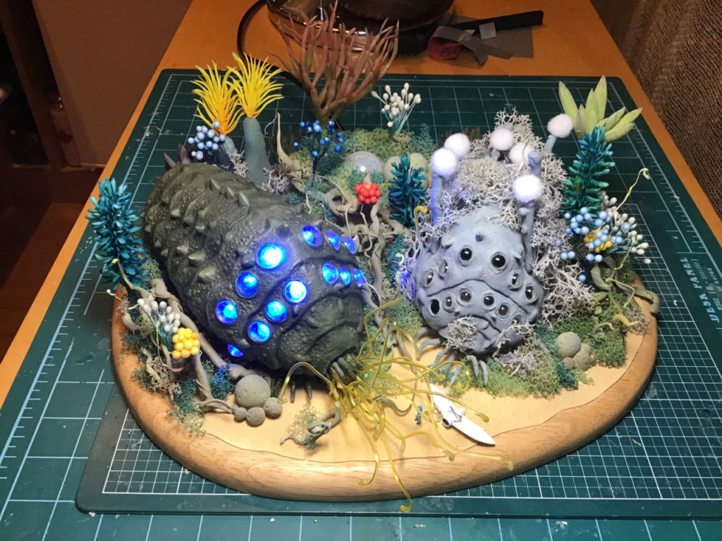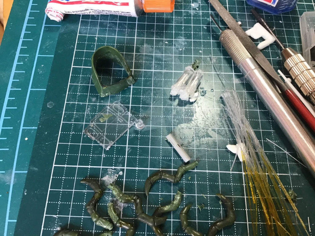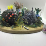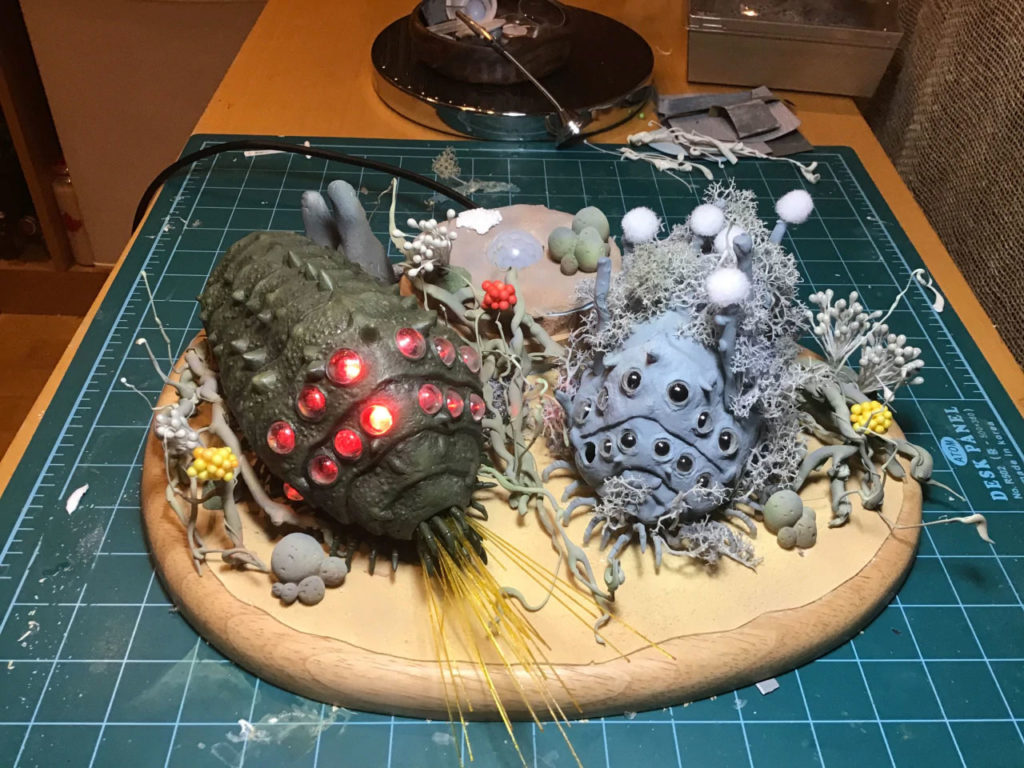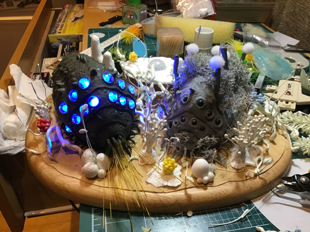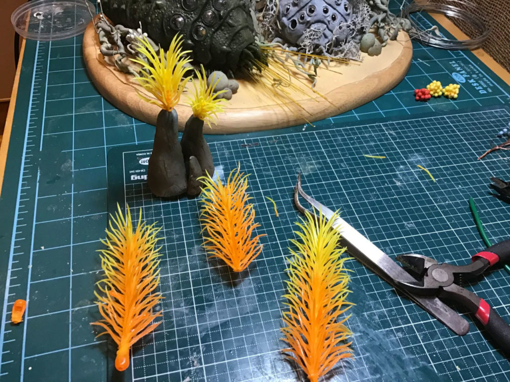 If you’re going to put together this mass of electronics in a model, you need a good place to hide them. So, after securing a wooden serving tray from the local dollar store and flipping it upside down, I used some textured and painted “angel clay” to added a “sandy” ground. I bought a bunch of plastic plants from the dollar store as well, but the look was more “Mrs. Brown’s 4th Grade Class Terrarium” than “Sea of Corruption”, so I started making my own flora and fauna. I stretched and pulled some sprues into random “organic” shapes. Then I painted some synthetic sponge a bunch of colours and applied it as undergrowth. Then finally I bent some wires, glued on some styrafoam balls, shapes more angel clay into spore pods and painted a few of the goofier-looking plastic plants. Once it was all painted and assembled, I was pretty happy with how turned out. It was a bit tedious, but also lot more authentic, if I say so myself.