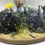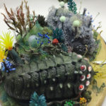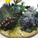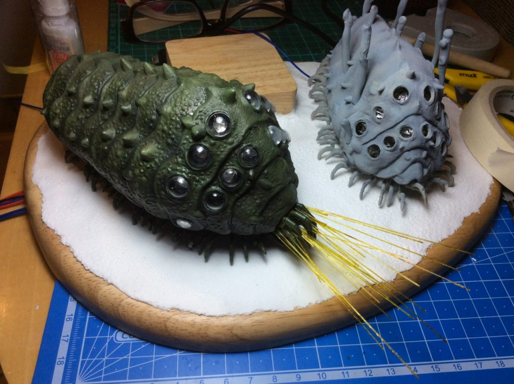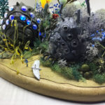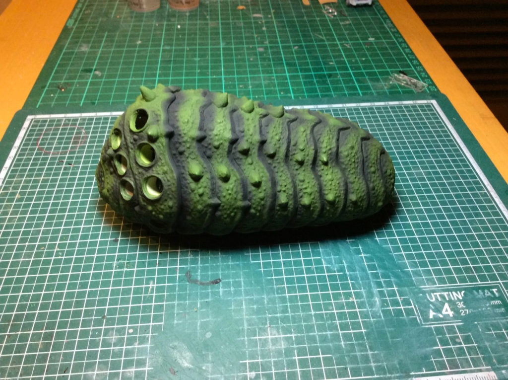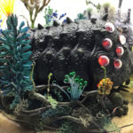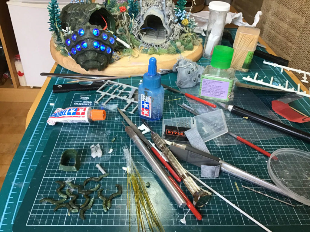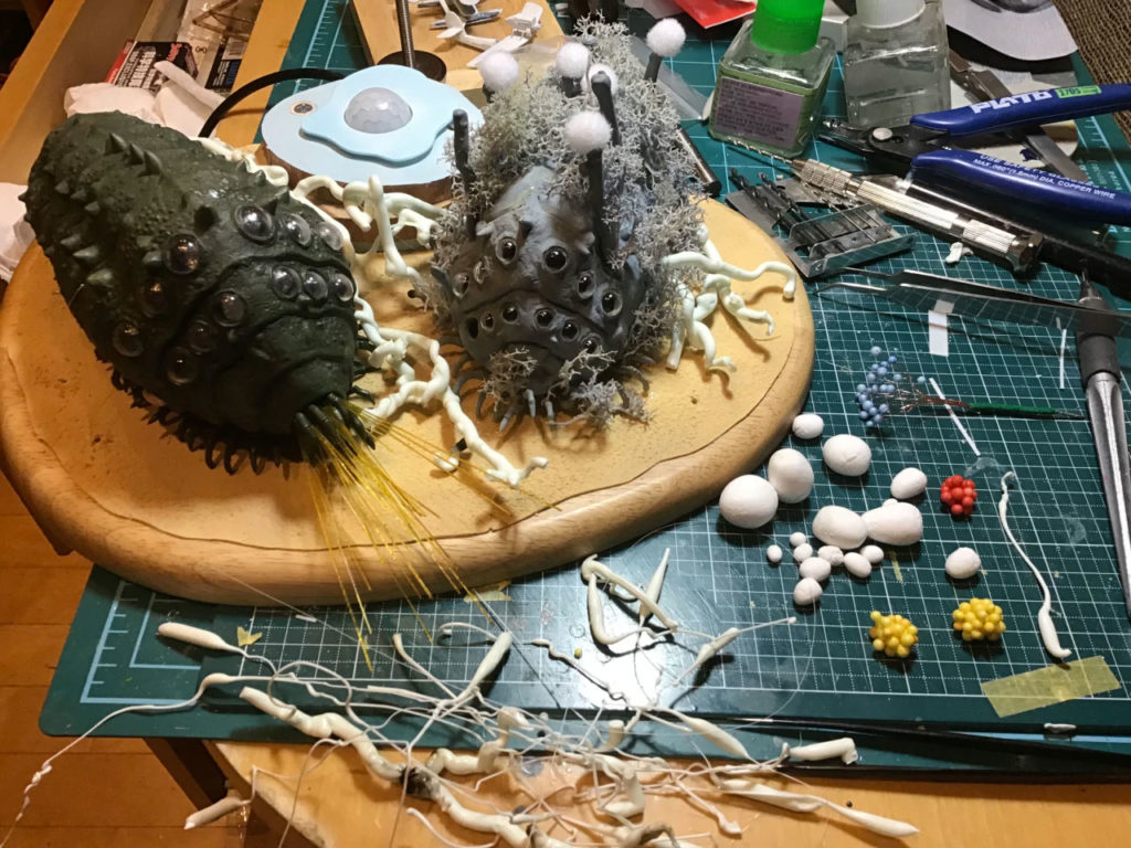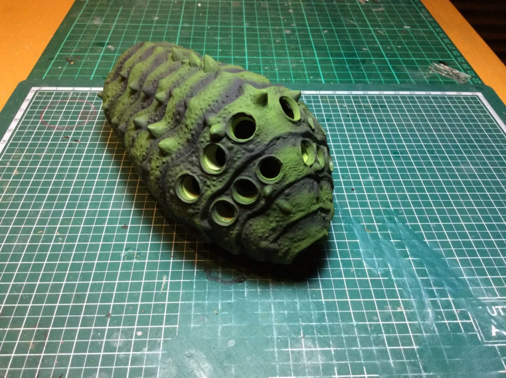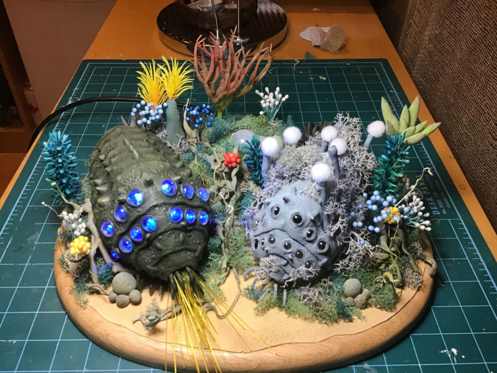 If you’re going to put together this mass of electronics in a model, you need a good place to hide them. So, after securing a wooden serving tray from the local dollar store and flipping it upside down, I used some textured and painted “angel clay” to added a “sandy” ground. I bought a bunch of plastic plants from the dollar store as well, but the look was more “Mrs. Brown’s 4th Grade Class Terrarium” than “Sea of Corruption”, so I started making my own flora and fauna. I stretched and pulled some sprues into random “organic” shapes. Then I painted some synthetic sponge a bunch of colours and applied it as undergrowth. Then finally I bent some wires, glued on some styrafoam balls, shapes more angel clay into spore pods and painted a few of the goofier-looking plastic plants. Once it was all painted and assembled, I was pretty happy with how turned out. It was a bit tedious, but also lot more authentic, if I say so myself.