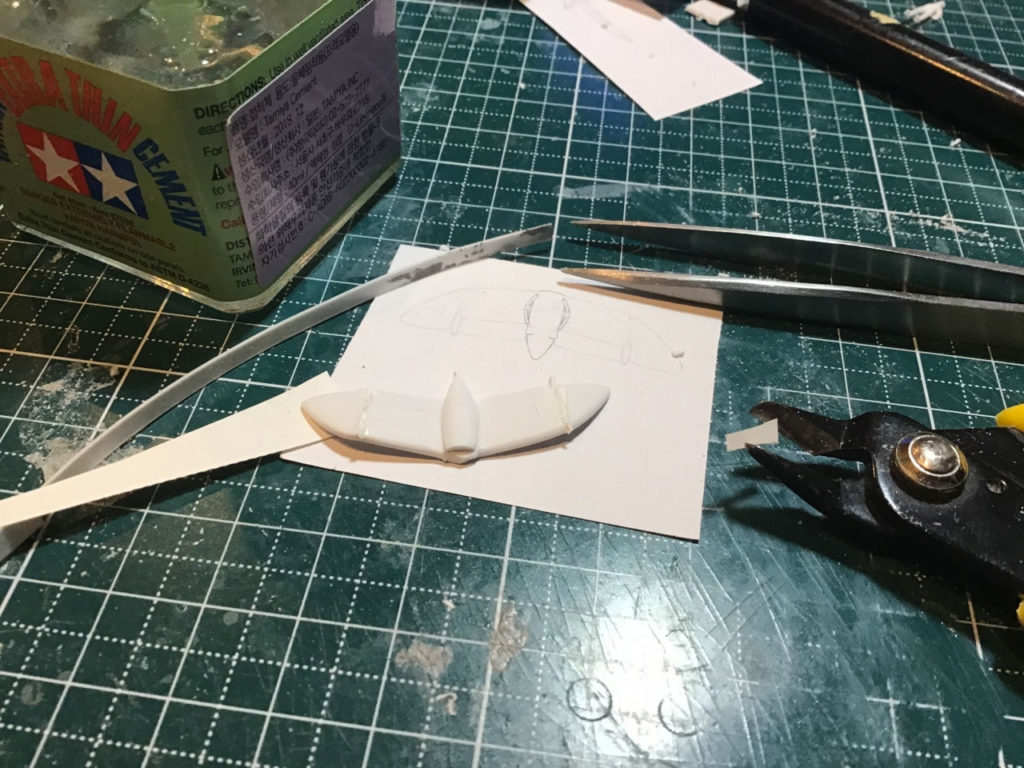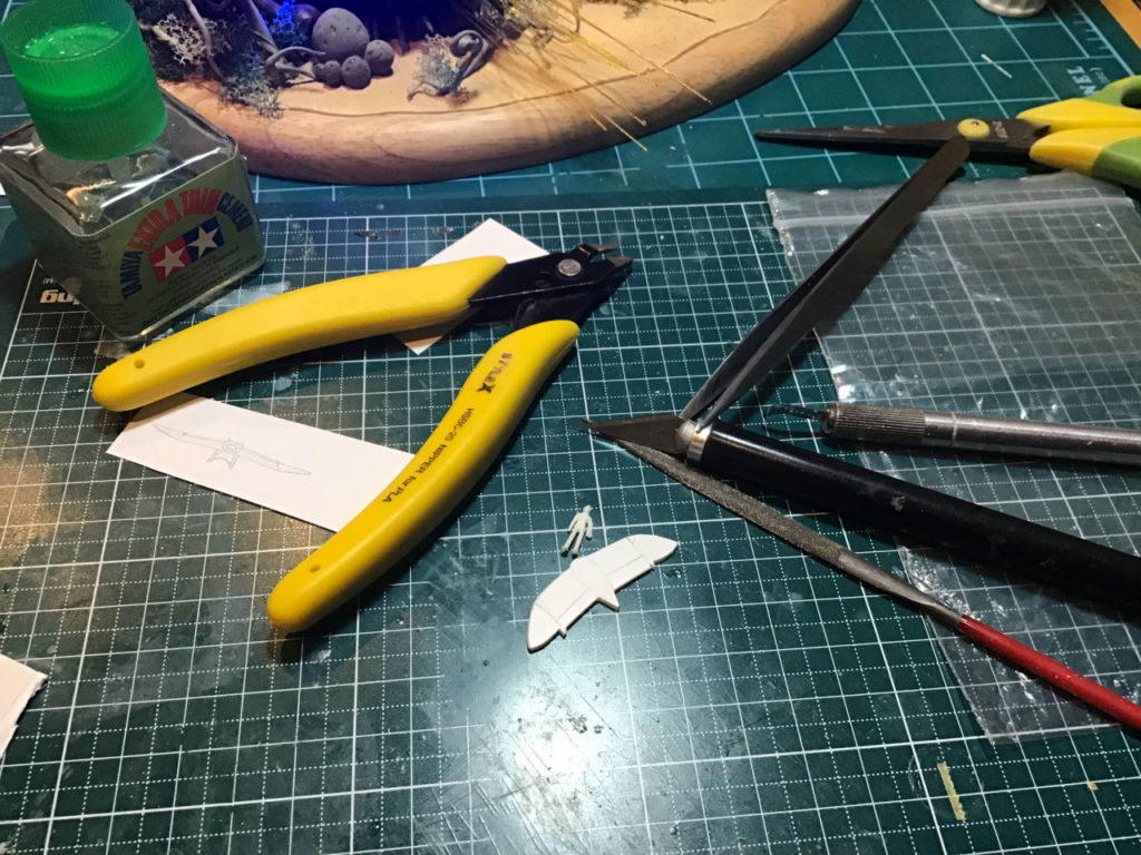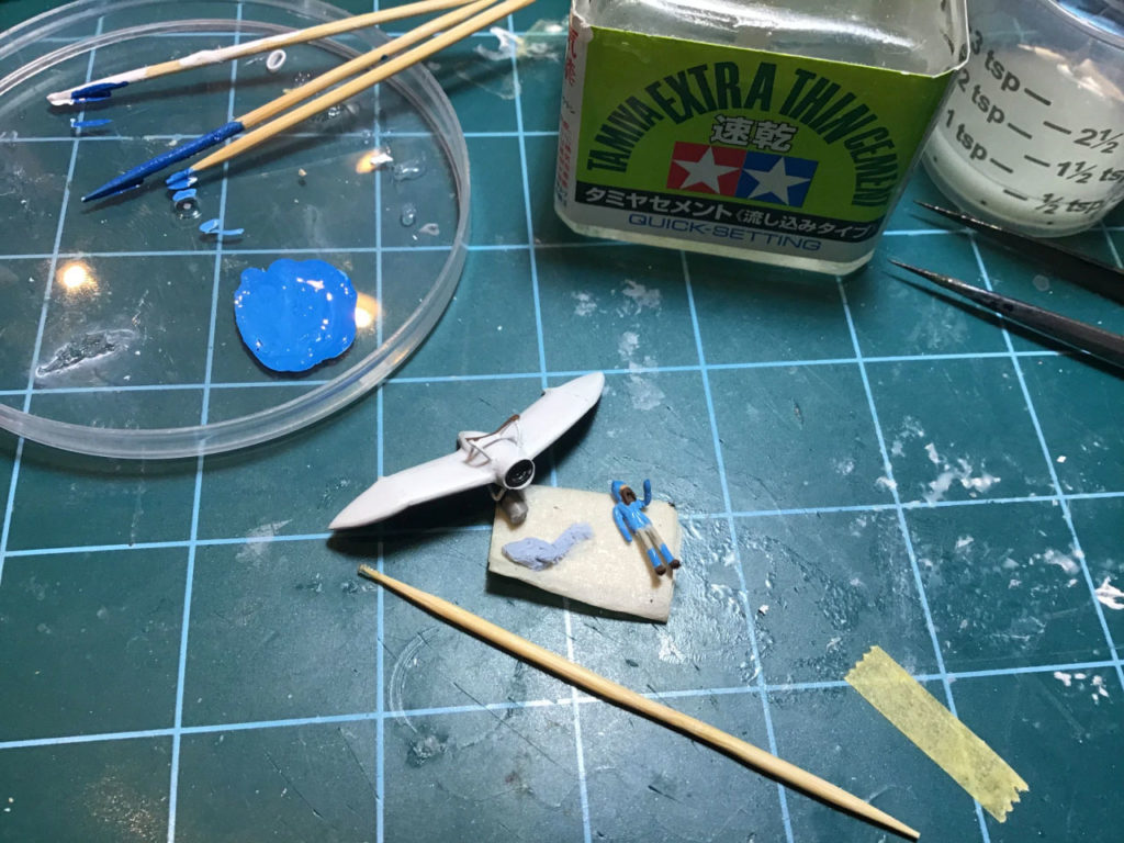 As I mentioned, if you want to convert a 1/20 scale kit into a 1/144 one, what you really need is to stick it next to a 1/144 one. Since I didn’t really have one, I decided to scratch build my own 1/144 scale Nuasicaa and Mehve. Since I’d already built a Nausicaa Mehve in 1/72 scale, I had a pretty good idea of what was needed. It wasn’t too hard, I just cut some plastic sheet out in the basic outline and then sanded, scored, and bent it into shape. As luck would have it, I also had a reasonably similar figure in my drawer that I converted into Nausicaa with a slight adjustment to the head and a proper paint job.
